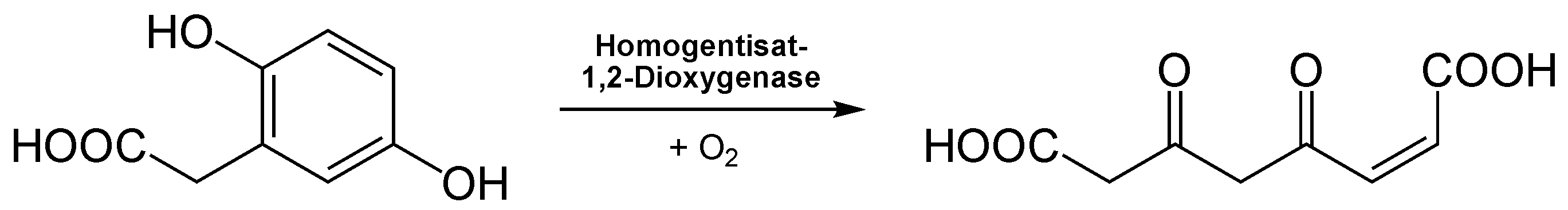 호모젠티스산은 효소 호모젠티스산 1,2-디옥시게나제에 의해 4-말레일아세토아세트산으로 전환된다.[6] 호모젠티스산은 페닐알라닌과 티로신과 같은 방향족 아미노산의 이화 작용에 관여하는 중간체이다.[5] 4-하이드록시페닐피루브산은 효소 4-하이드록시페닐피루브산 디옥시게나제에 의해 작용하여 호모젠티스산을 생성한다.[5]3. 인체 병리학