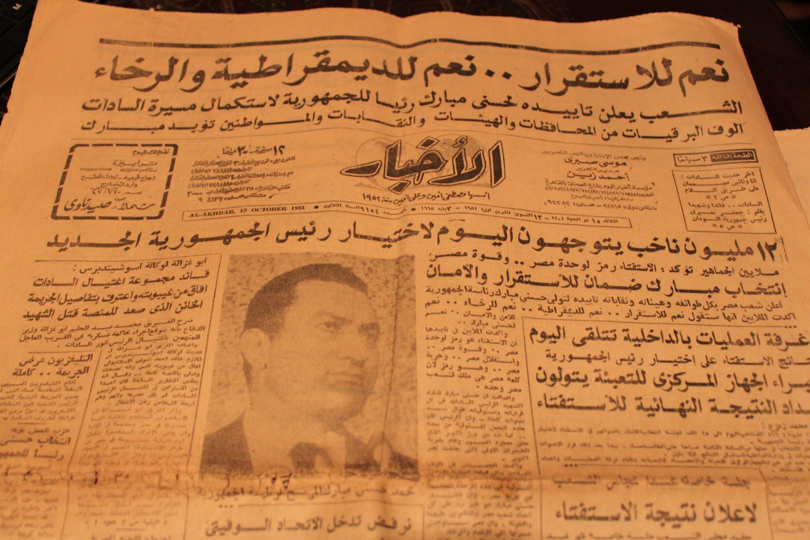 1981년 10월 6일, 사다트 대통령 암살 사건 당시 현장에 함께 있다 부상을 입었으며[38], 사다트 사망 이후 같은 해 10월 14일 이집트의 제4대 대통령으로 취임했다.