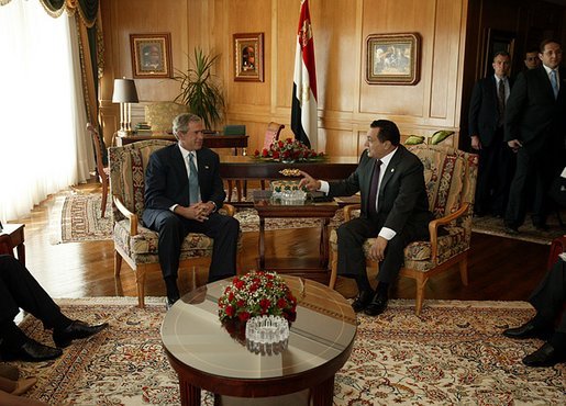 외교적으로는 친서방 노선을 유지하면서도 실리적인 접근을 취했다. 사다트 시절 악화되었던 소비에트 연방과의 관계를 1984년에 복원했으며, 캠프 데이비드 협정 체결로 아랍연맹에서 축출되었던 이집트의 위상을 회복하는 데 주력했다. 1982년 사우디아라비아와의 관계 개선을 시작으로[40], 이란-이라크 전쟁 당시 이라크를 지원하며[41] 아랍 세계 내 영향력을 확대했다. 1983년에는 팔레스타인 해방기구(PLO)의 야세르 아라파트를 카이로로 초청하여 관계를 복원했고[42], 1989년에는 아랍연맹에 정식으로 복귀하여 연맹 본부를 다시 카이로로 이전시키는 데 성공했다.[44][45] 1989년에는 이라크, 예멘, 요르단과 함께 아랍 협력 이사회를 결성했으나, 1990년 걸프 전쟁 발발 시 이라크의 쿠웨이트 침공을 비난하며 와해되었다. 무바라크는 1991년 걸프 전쟁에서 미국 주도의 다국적군에 이집트군 파병을 결정했으며, 시리아의 참전에도 영향을 미친 것으로 알려졌다.[161] 2001년 9·11 테러 이후에는 미국의 대테러 정책에 협조하며 이슬람 원리주의 단속을 강화했다. 이러한 친미, 친서방 노선은 서방 국가들의 긍정적인 평가를 받았고, 2000년대 이후 외자 유치를 통해 이집트 경제의 성장을 이끄는 요인이 되기도 했다.