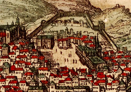 16세기 지도에 묘사된 호시우 광장 주변 지역의 그림. 이미지 중앙의 광장은 에스타우스 궁전(광장 왼쪽 상단)과 거대한 모든 성인 병원(오른쪽)으로 둘러싸여 있다.