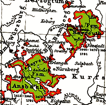 1427년, 브란덴부르크 선제후 프리드리히는 뉘른베르크 제국 자유 도시에 뉘른베르크 성과 부르크그라프로서의 권리를 매각했다.[10] 브란덴부르크-안스바흐와 브란덴부르크-쿨름바흐의 영토는 뉘른베르크 부르크그라비아의 일부였으며 가족의 소유로 남았다.[10]