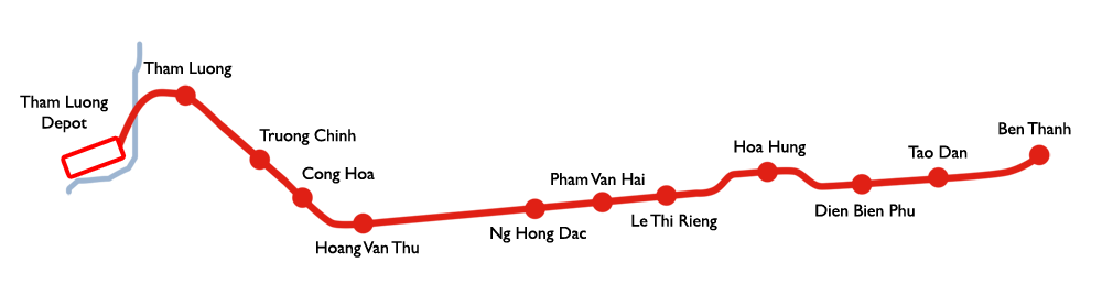 48km42꾸찌 현 -떠이닌 버스역- 탐르엉 - 벤타인 - 투티엠1단계: 벤타인 - 탐르엉 (11개 역 건설 중)[30], 2030년 완공 예정[13]