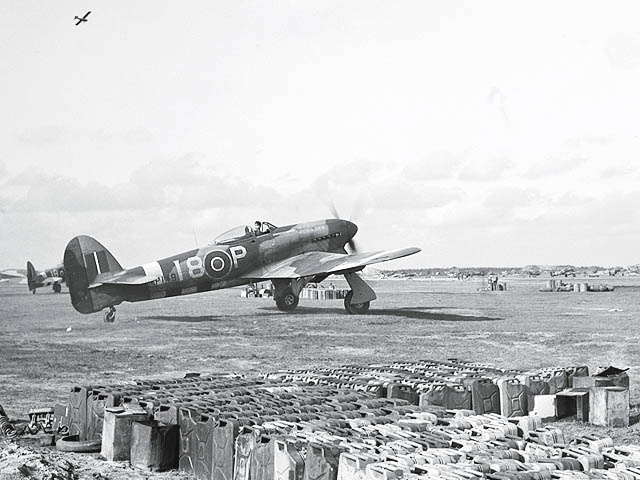 1944년 6월 노르망디 상륙 작전 당시, 2 TAF는 18개의 작전 타이푼 IB 비행대대를 보유했고, 영국 공군 전투 사령부는 추가로 9개의 비행대대를 보유했다.[39] 이 항공기는 침공 전에 북서유럽 깊숙한 곳의 통신 및 수송 목표물을 상대로 한 차단 공격에서, 그리고 D-Day 이후 연합군 지상군을 직접 지원하는 데 가장 효과적인 영국 공군 전술 공격 항공기로 입증되었다.[39] 영국 공군과 육군은 지상군과의 긴밀한 연락 체계를 구축했다. VHF 무선 전신 (R/T)이 장착된 차량에 탑승한 영국 공군 무선 통신병은 최전선에 가까이 있는 병사들과 함께 이동했고, 캐브 랭크에서 운용되는 타이푼을 호출하여 박격포나 포병이 발사한 연막탄으로 표시된 목표물을 파괴할 때까지 공격했다.[40]