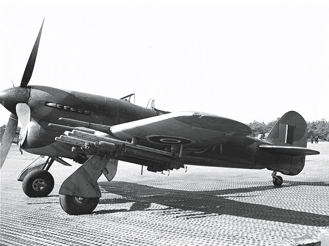 1943년 6월, 호커는 타이푼에 날개당 4개의 강철 "Mark I" 로켓 레일을 장착했다. 그 결과, Mk I 레일과 RP-3가 1943년 10월 제181 비행대대의 생산 항공기에 처음으로 장착되었다.[80] 노르망디 상륙 작전까지 제2 전술 항공 사령부(TAF)는 11개 RP("로크폰") 타이푼 비행대대와 7개의 "폭탄 장착 타이푼" 비행대대를 투입할 수 있었다.[81]