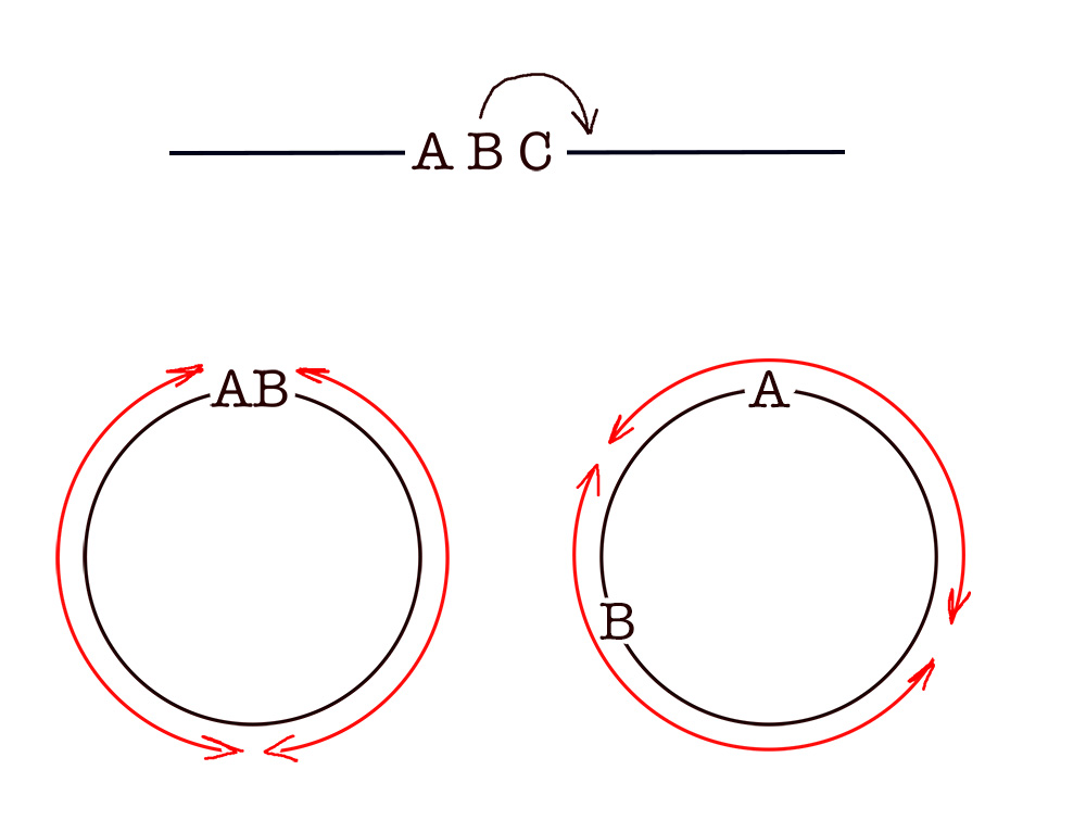 선형 도로와 달리 원형 경로의 경우, 두 개의 판매대 A와 B는 경로를 따라 어디든 위치할 수 있으며 고객을 균등하게 공유할 수 있다. 그러나 세 번째 판매대를 도입하면 다시 불안정한 평형 상태가 되어, 세 판매대 모두 위치를 놓고 다투면서 원의 어딘가에 군집하게 된다.