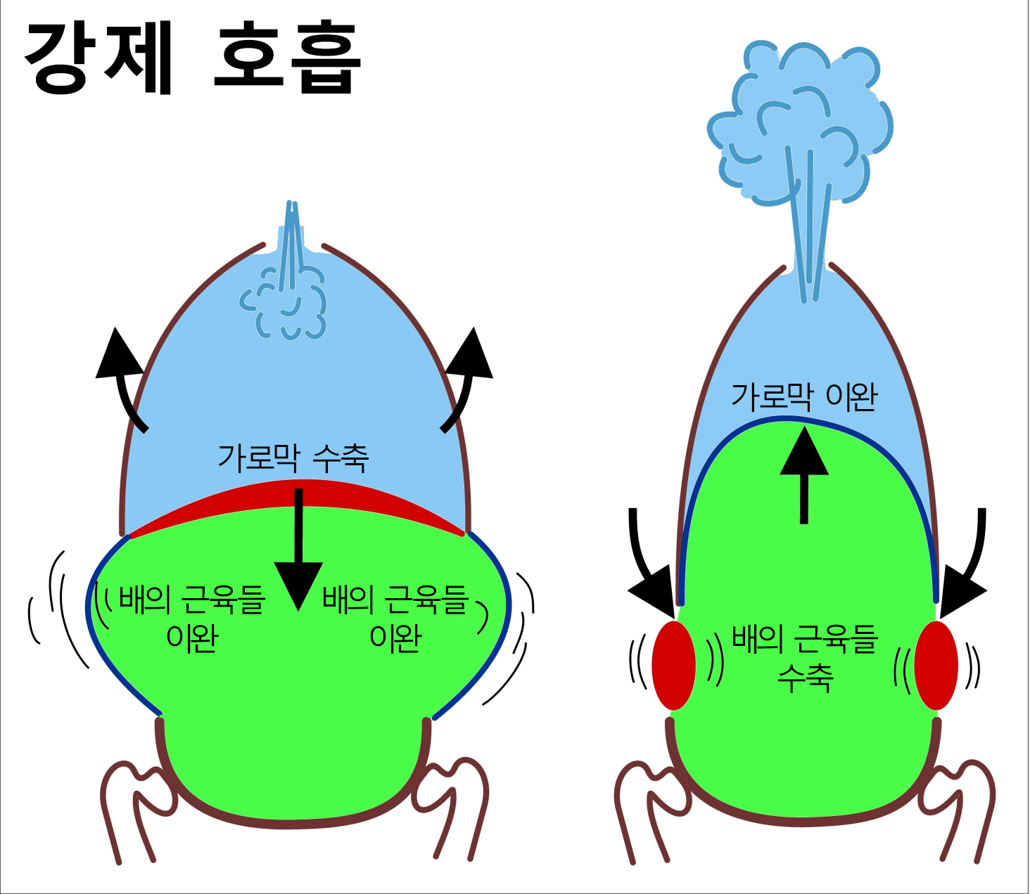 평상시 호흡에서는 호기할 때 근육 수축이 거의, 또는 전혀 없다. 이 과정은 단순히 가로막이 이완되고, 폐의 탄력 반동에 의해 폐 부피가 감소하면서 일어난다.[20] 강제적인 호기가 필요하거나 폐기종과 같이 폐 탄력이 감소한 경우 배벽 근육(배곧은근, 배가로근, 배바깥빗근, 배속빗근)이 수축하여 능동적인 호기가 일어날 수 있다. 이 근육들은 수축하면 배 안의 장기를 가로막 쪽(위쪽)으로 눌러 가슴안의 부피를 줄인다.[8]속갈비사이근은 갈비뼈에서 다른 갈비뼈까지 아래쪽으로 비스듬히 뒤쪽으로 기울어진 섬유로 이루어져 있다.[9] 따라서 이 근육은 바깥갈비사이근과는 반대로 가슴우리를 낮추는 데 도움을 주어 호기를 보조한다.[8]