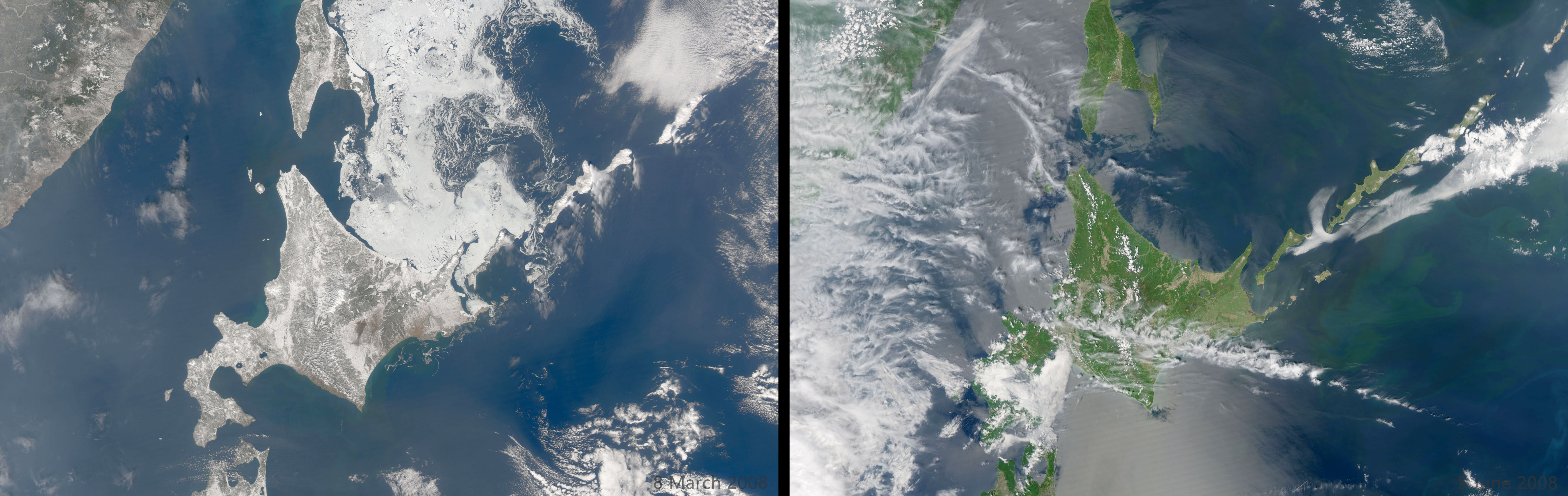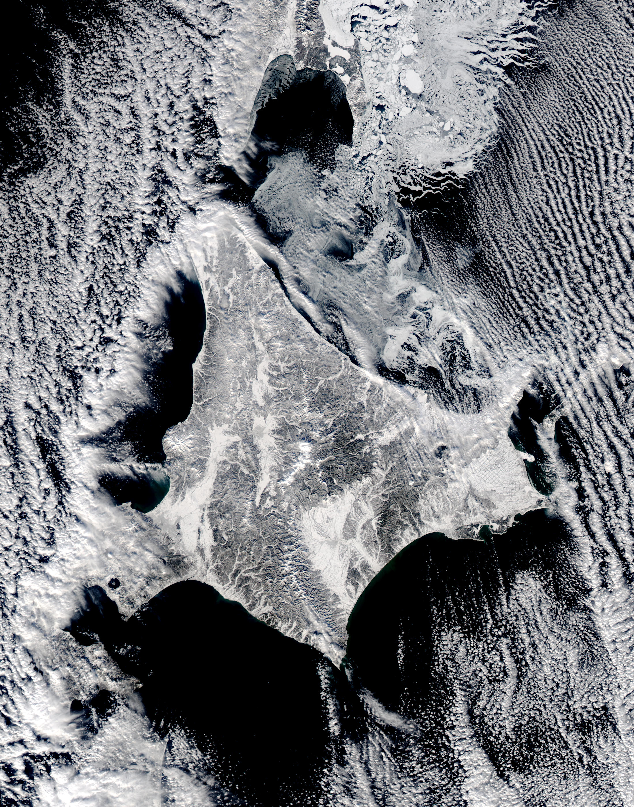 홋카이도 서쪽 동해에는 오쿠시리섬(奥尻島일본어), 오시마섬(大島일본어), 고지마섬(小島일본어)이 있으며, 북쪽의 리시리섬(利尻島일본어), 레분섬(礼文島일본어), 데우리섬(天売島일본어)과 함께 동해의 섬 배열을 형성한다.[189]