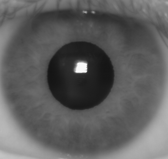 홍채의 복잡한 무늬를 이미지로 얻기 위해 각막으로부터의 정반사를 최대한 발생시키지 않도록 미세한 적외선 조명을 이용하여 카메라로 촬영한다.