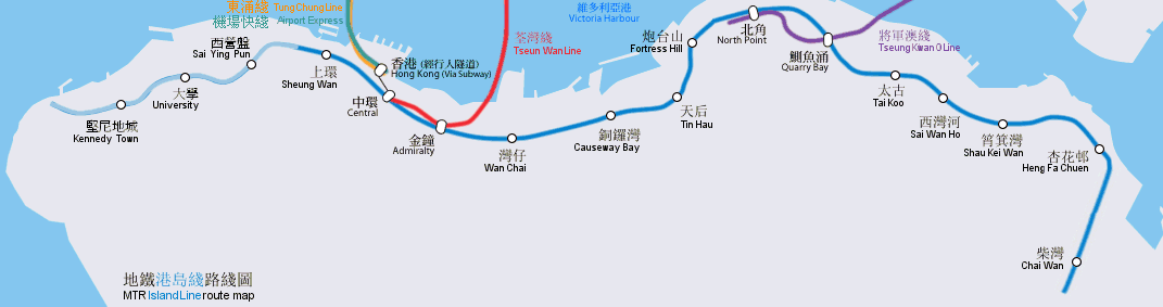 홍콩 트램은 1904년부터 운행을 시작하여 홍콩섬 북부 해안을 따라 운행하며 2층 구조의 트램 163대를 운영하고 딩딩이라는 애칭으로 불리는 홍콩의 주요 대중교통 수단이다. - 홍콩섬 - 서항성