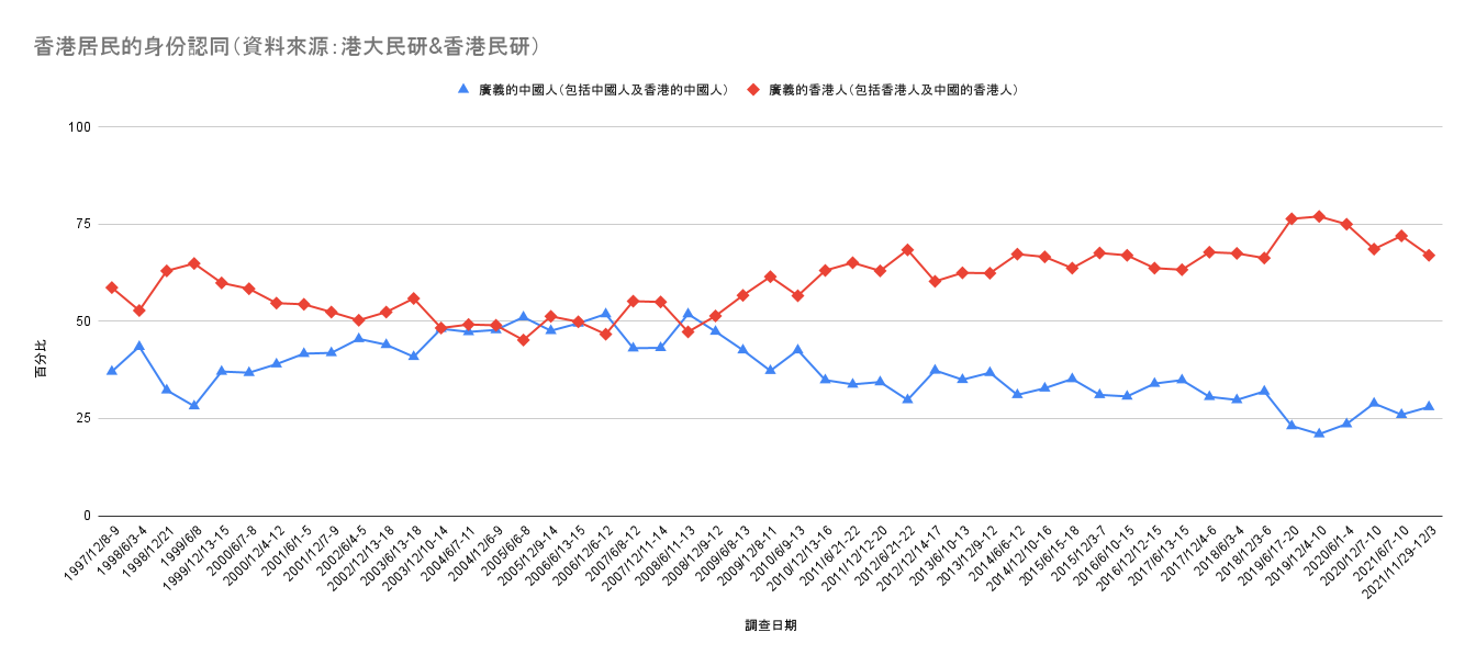 홍콩 대학교는 홍콩 반환 이후 홍콩 거주자들이 스스로를 어떻게 정의하는지에 대한 설문 조사를 실시했다. "홍콩인"으로 정체성을 밝히는 홍콩 거주자의 수는 2010년대에 걸쳐 천천히 증가하여, 2019–2020 홍콩 시위 기간과 직후에 최고점에 달했으며, 2019년 12월 조사에서는 응답자의 55% 이상이 "홍콩인"으로 확인되었으며, 가장 두드러진 증가는 젊은 거주자들 사이에서 나타났다.[40] 2020 홍콩 국가 보안법 통과와 홍콩에서 이민자의 잇따른 파도 이후, 그 비율은 감소했다. 2022년 6월에 발표된 최신 설문 조사에서 응답자의 39.1%는 홍콩인, 31.4%는 중국 내 홍콩인, 17.6%는 중국인, 10.9%는 홍콩 내 중국인, 42.4%는 혼합 정체성이라고 답했다.[41]