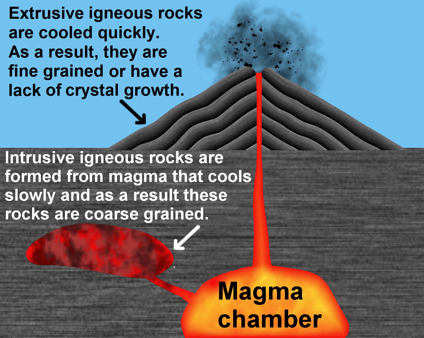 화성암은 산출 형태에 따라 크게 심성암(관입암)과 화산암(분출암)으로 구분된다.[1] 마그마가 지하 깊은 곳에서 천천히 식으면 심성암이 되고, 지표면 근처나 지표면에서 빠르게 식으면 화산암이 된다.