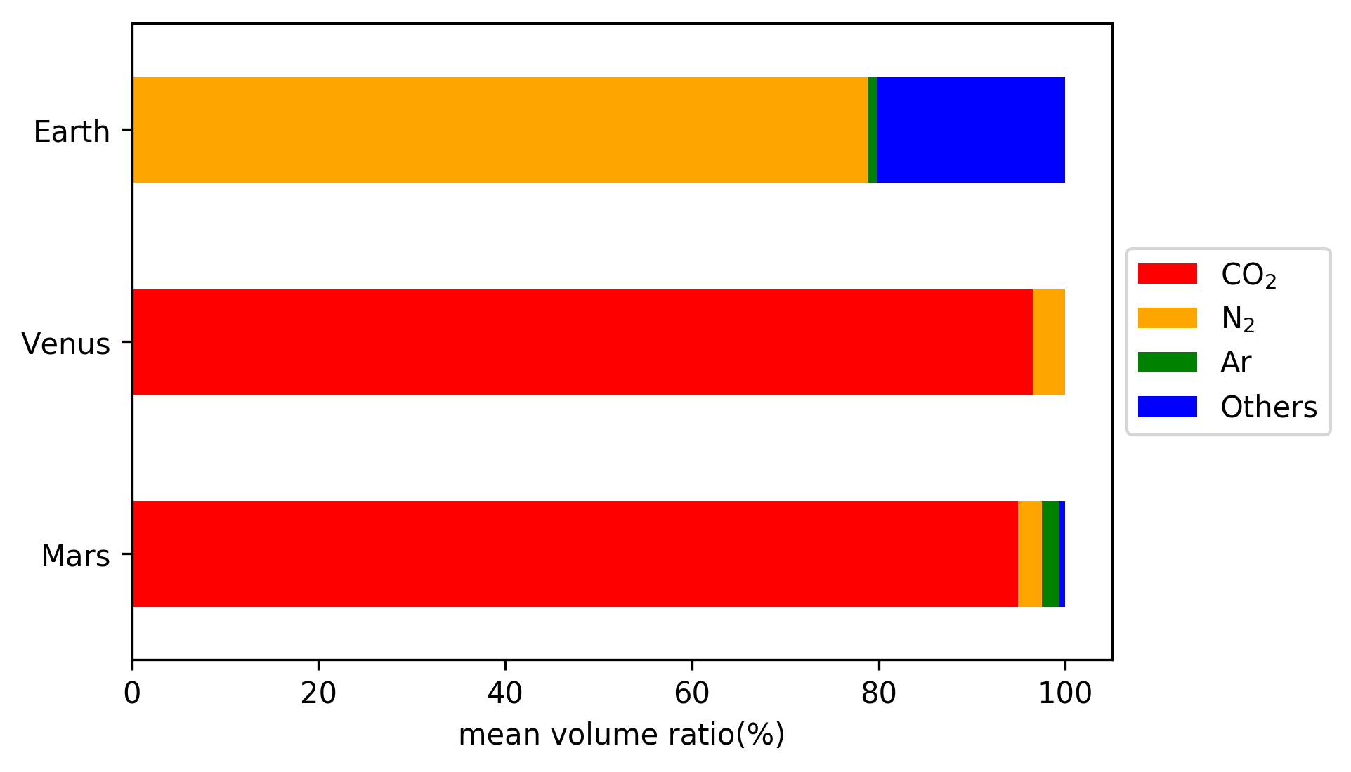 화성 대기에는 다음과 같은 주요 기체들이 포함되어 있다.