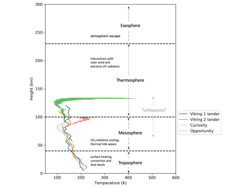 화성의 대기는 다음과 같은 구조로 나눌 수 있다.[4]