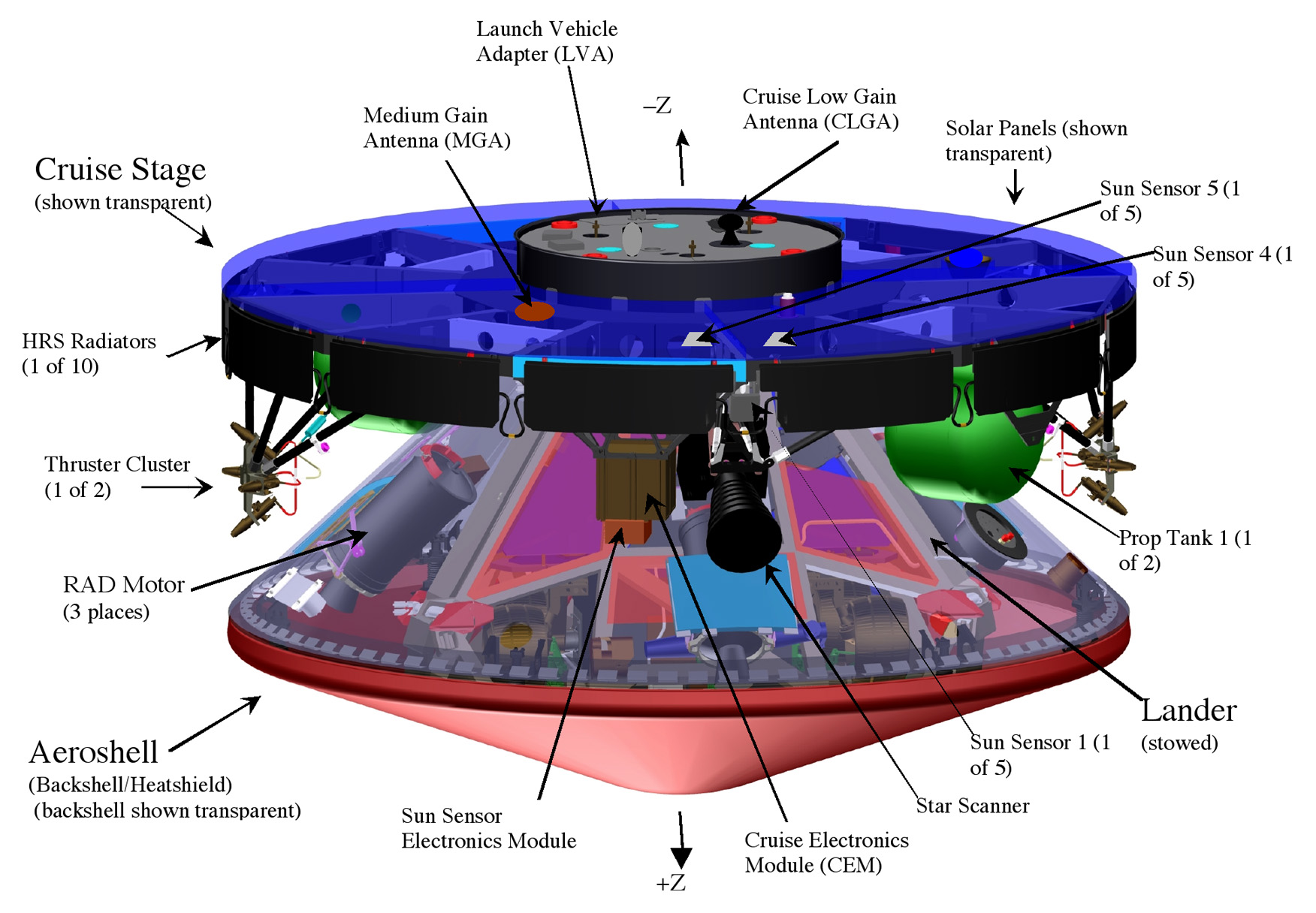 콜로라도주 덴버의 록히드 마틴에서 제작한 에어로셸은 그래파이트-에폭시 페이스 시트 사이에 알루미늄 벌집 구조를 끼운 형태이다. 에어로셸 외부는 페놀 벌집 층으로 덮여 있고, 이 벌집에는 열 차폐재(ablator)가 채워져 대기 마찰열을 발산한다.
