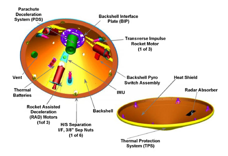 열 차폐재는 코르크 나무, 결합재, 미세한 실리카 유리 구체의 혼합물이다. 바이킹 화성 착륙선을 위해 개발되었으며, 머큐리 계획, 제미니 계획, 아폴로 계획에도 비슷한 기술이 사용되었다. 진입 중 화성 대기와 화학 반응하여 열을 제거하고 차량 뒤에 뜨거운 가스 자국을 남기도록 제작되었다. 차량은 약 1분 만에 19000km/h에서 1600km/h로 감속되어 착륙선과 로버에 약 60m/s²(6g)의 가속도를 발생시켰다.