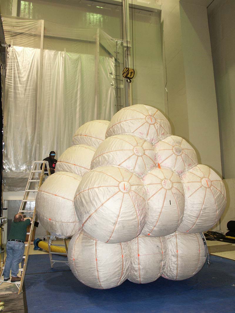 낙하산은 내구성이 뛰어나고 가벼운 폴리에스터와 나일론으로 만들어졌고, 케블라로 만든 삼중 브라이들이 낙하산을 백쉘에 연결한다. 우주선 내 낙하산 공간이 매우 적어 압축 포장해야 했다. 발사 전, 한 팀이 48개의 현수선, 3개의 브라이들 라인과 낙하산을 단단히 접었다. 낙하산은 특수 구조물에 적재되었고, 여러 번 무거운 무게를 가했다. 백쉘에 넣기 전, 낙하산은 열처리로 살균되었다.[40]