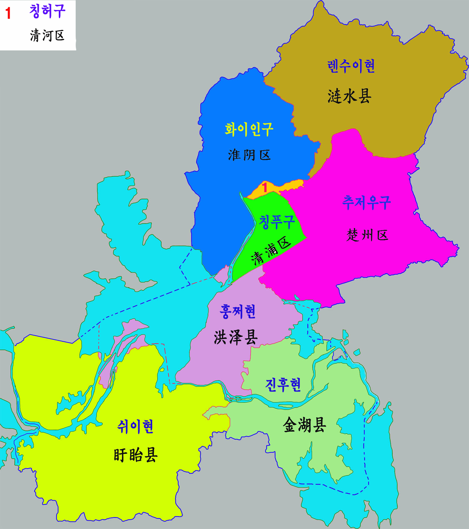 현 | 화이안 구 (淮安区) 화이인 구 (淮阴区) 칭푸 구 (清浦区) 렌윈 구 (涟水区) 홍쩌 현 (洪泽县) 진후 현 (金湖县) 시위 현 (盱眙县) |