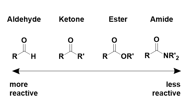 일반적으로 알데하이드는 가장 반응성이 높은 카보닐 화합물이다. 이는 알데하이드의 카보닐 탄소에 결합된 수소 원자가 크기가 작고 전자를 하나만 가지고 있어 입체적으로나 전자적으로 카보닐 탄소를 거의 가리지 않기 때문이다. 반면, 수소 대신 탄소 그룹이 결합된 케톤은 알데하이드보다 반응성이 낮다. 탄소 그룹은 수소보다 크고 더 많은 전자를 가지고 있어 카보닐 탄소를 더 효과적으로 가리고 안정화시키기 때문이다.