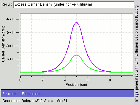 여기서 ''D''h는 정공의 확산 계수, 는 x축 방향으로의 정공 농도 기울기이다. 정공은 양전하를 가지므로 피크의 법칙에서 나온 마이너스 부호가 유지된다.
