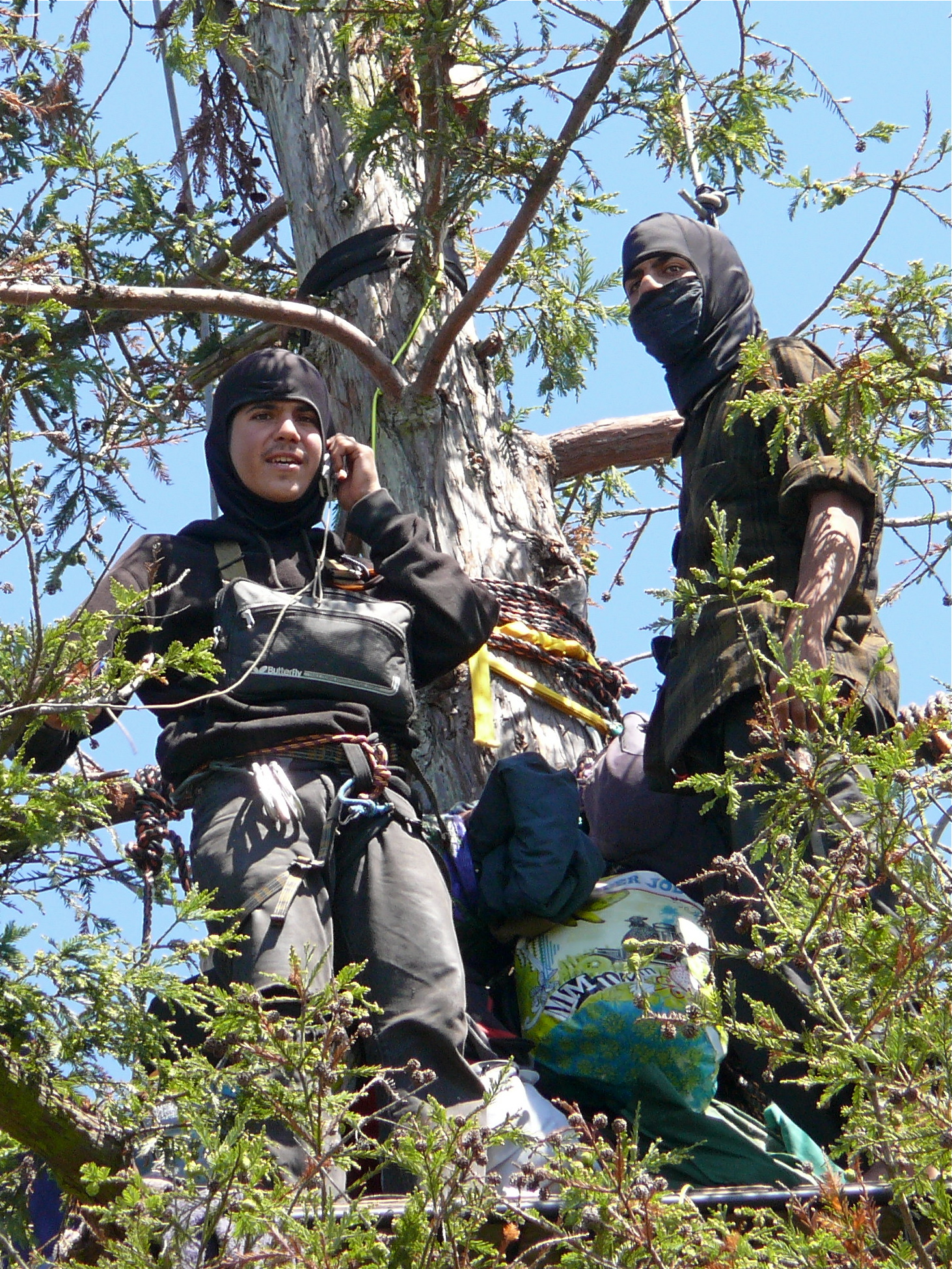 나무에 올라타기는 나무 제거를 막거나 특정 지역의 철거를 막기 위한 시위 형태이다. 줄리아 버터플라이 힐은 캘리포니아 레드우드에서 738일 동안 나무 위에서 생활하며 3에이커 규모의 숲을 구했다.[54] 2018년부터 2021년까지 932일 동안 마운틴 밸리 파이프라인을 봉쇄한 옐로우 핀치 나무 앉기도 주목할 만하다.[55][56]