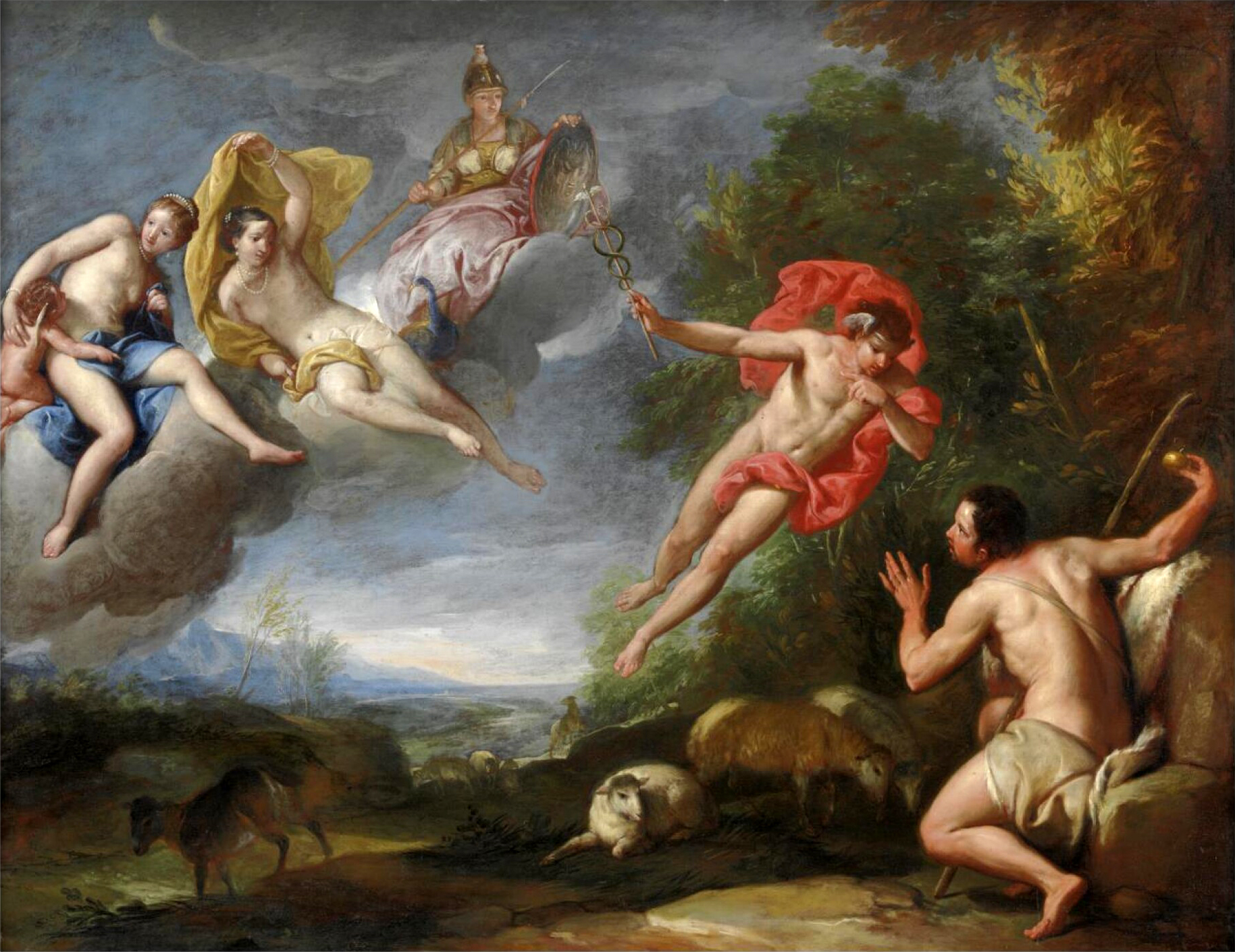 세 여신은 제우스에게 누가 가장 아름다운 여신인지 판결해 달라고 요청했지만, 제우스는 이 문제에 관여하고 싶지 않아 트로이의 왕자 파리스에게 심판을 맡겼다. 파리스는 이전에 황소로 변신한 아레스가 자신의 상을 받은 황소를 이겼을 때 주저 없이 아레스에게 상을 수여하여 공정성을 인정받은 적이 있었다.