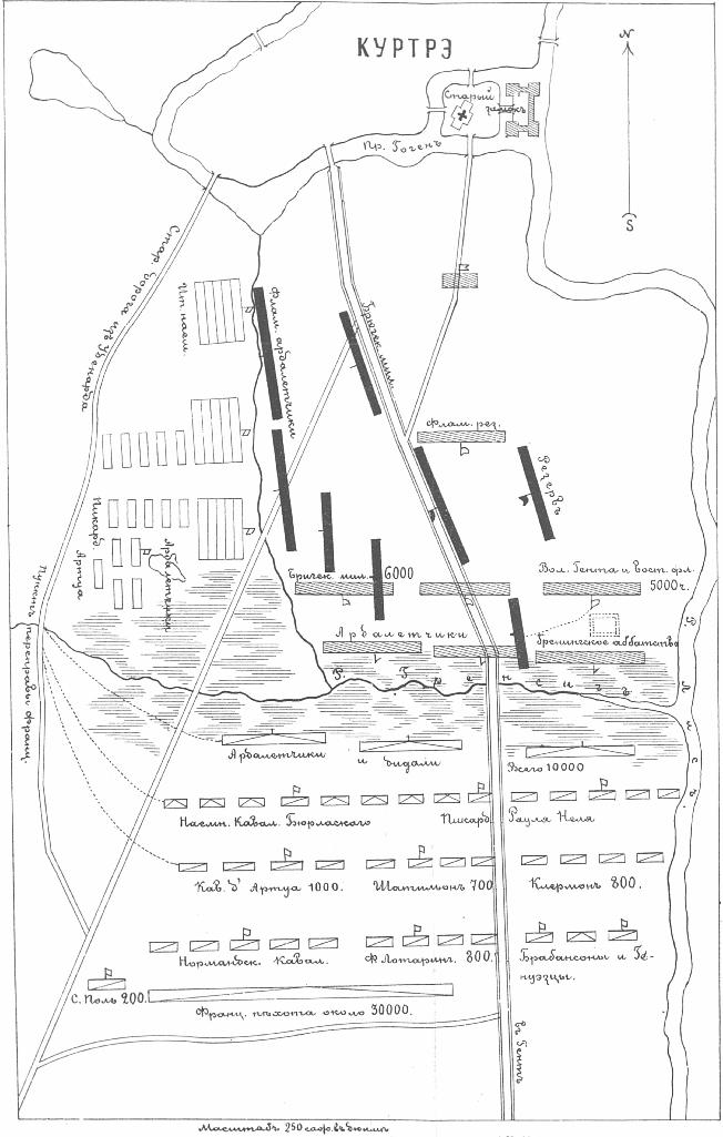 1,000명의 프랑스 석궁병이 900명의 플랑드르군 석궁병을 공격하면서 전투가 시작되었고, 프랑스군이 우세했다.[2] 그러나 플랑드르군은 강력한 방어선을 구축하여 큰 피해를 입지 않았다.[2]