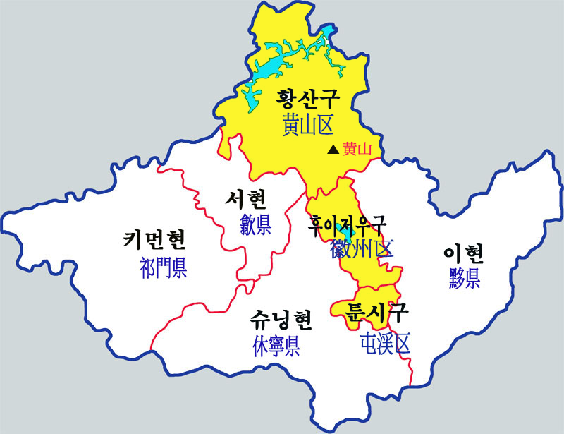 황산시는 중화인민공화국 안후이성에 위치한 지급시로, 역사적으로 휘주(徽州)로 불리며 신안 상인(徽商)의 근거지였다. 툰시구, 황산구, 휘저우구 등 3개의 시할구와 4개의 현으로 구성되어 있으며, 기문 홍차와 모봉 녹차, 그리고 황산을 중심으로 한 관광 산업으로 유명하다. 험준한 지형으로 인해 교통이 발달하지 못했으나, 최근 항공, 철도, 도로 등 교통 인프라가 개선되었다. 명나라 시대에는 정지진이 오페라 《목련구모》를 썼으며, 현재는 산마리노의 세라발레와 자매 도시 관계를 맺고 있다.