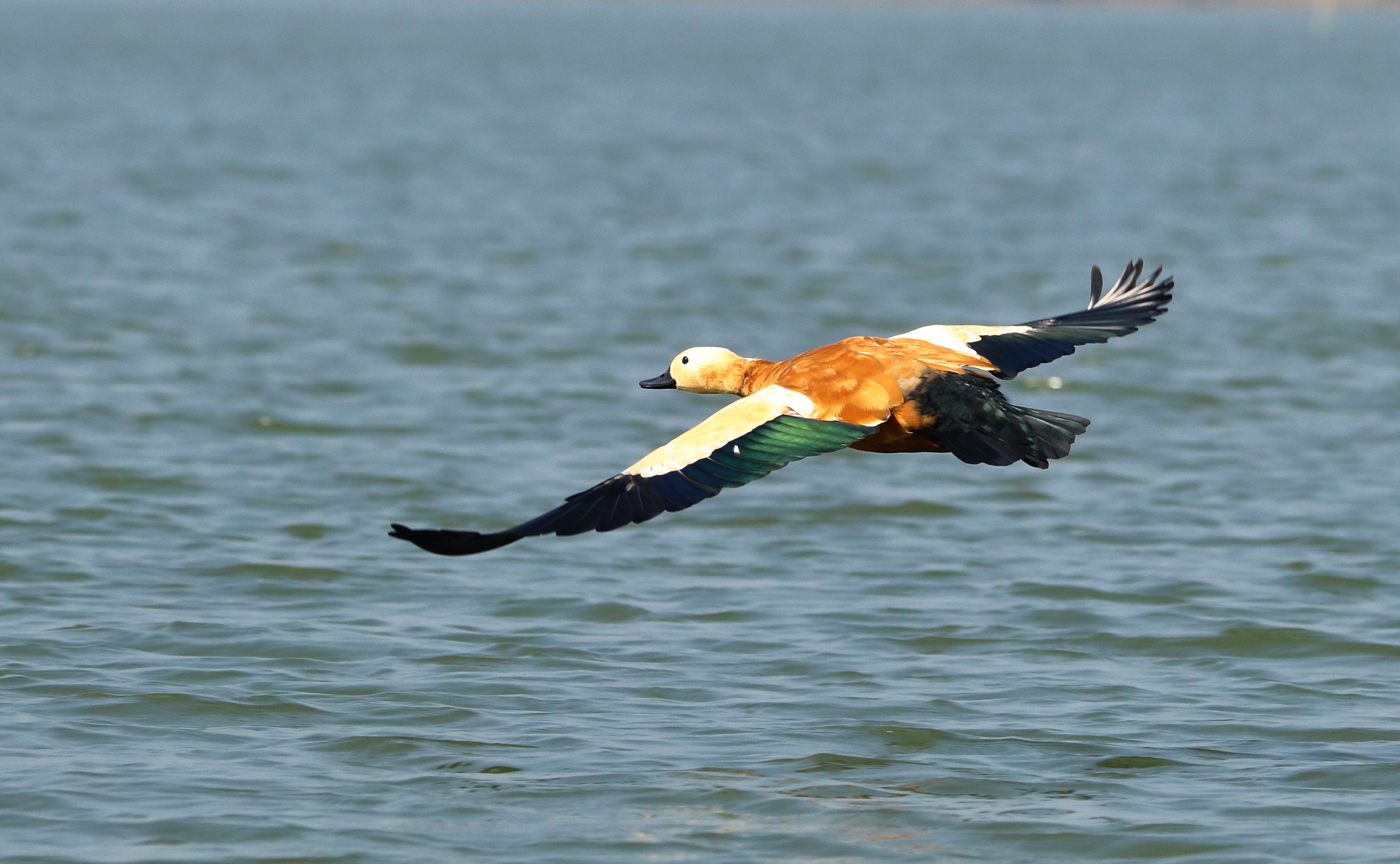 전체 길이는 63~66cm이다.[15] 날개 길이는 수컷 36.5~38.7cm, 암컷 34~35.5cm이다.[16] 날개를 펼친 길이는 121~145cm이다.[15] 전신의 깃털은 주황색, 주황적색, 주황갈색, 적갈색이며,[18] 머리 부분은 옅은 색이다.[15][16][17] 작은 덮깃은 흰색이다.[14][15][17] 날개깃은 검고,[18] 둘째 날개깃의 광택(날개거울)은 녹색이다.[15][17]