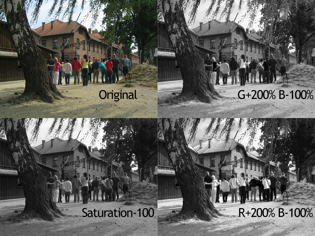 임의의 색상 이미지를 회색조로 변환하는 것은 일반적으로 고유하지 않다. 색상 채널의 가중치가 다르면 카메라에 서로 다른 색상의 사진 필터를 사용하여 흑백 필름을 촬영하는 효과를 나타낸다.[2] Color image영어를 그레이스케일로 변환하는 방법은 여러 가지가 있으며, 색상 Channel (digital image)|채널영어의 차이에 따라 흑백 이미지라도 카메라의 렌즈 필터에 따라 다른 색이 나타난다.
