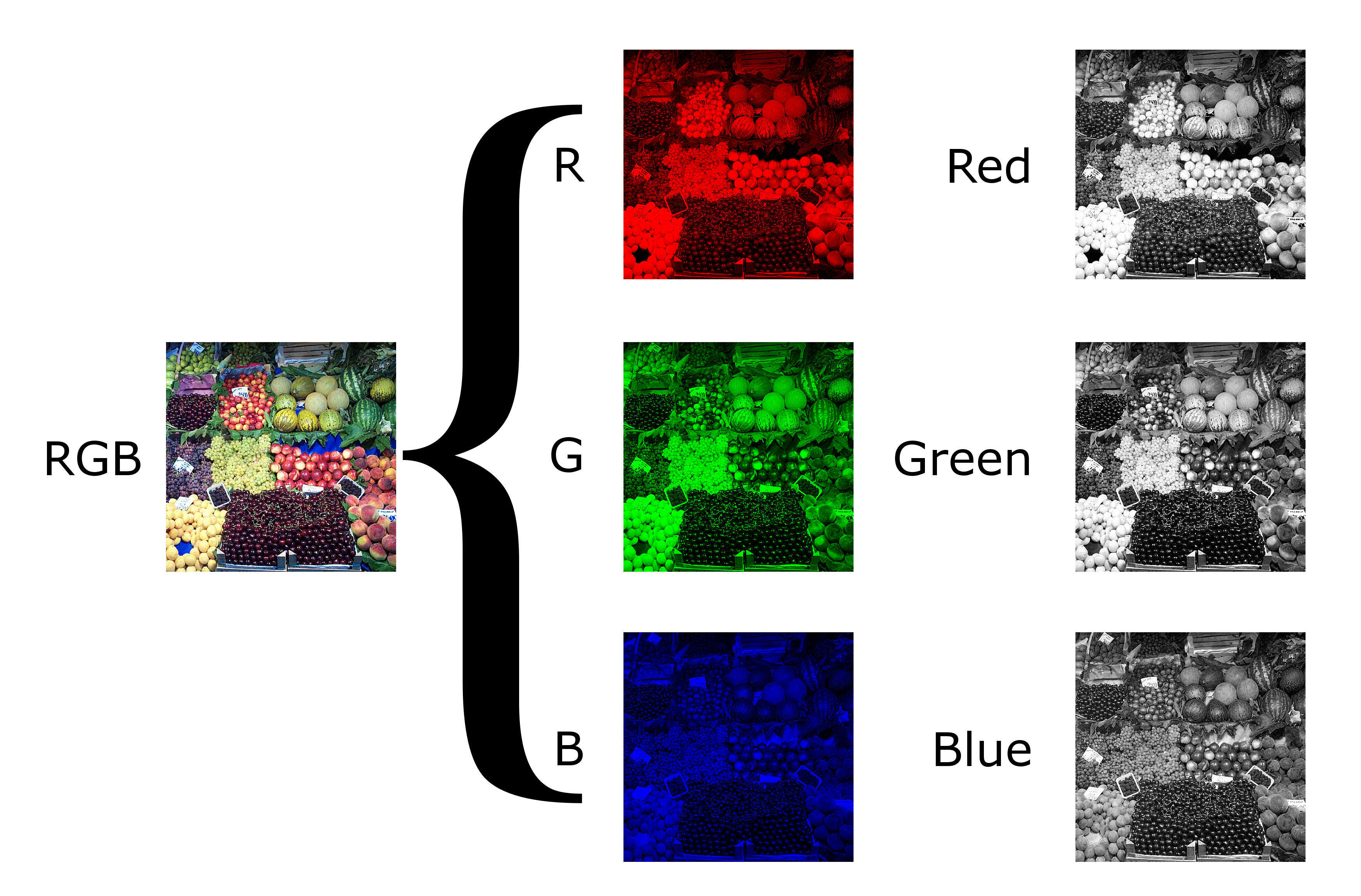 다음은 전체 RGB 컬러 이미지의 색상 채널 분할 예시이다. 왼쪽 열은 자연색으로 분리된 색상 채널을 보여주고, 오른쪽 열에는 그레이스케일 등가물이 있다.