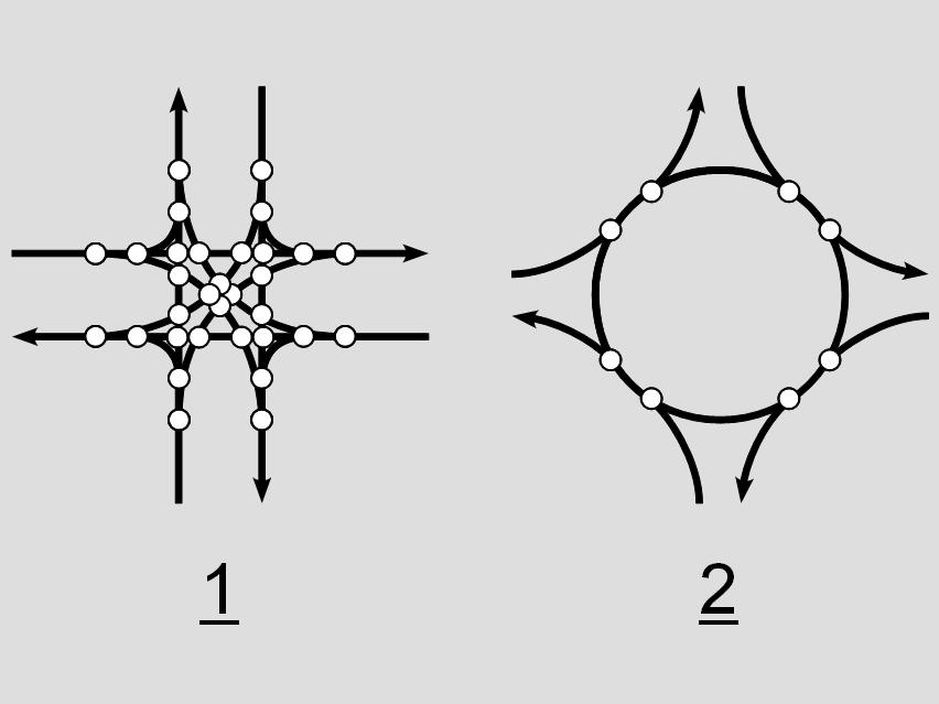 굵은 선은 차량의 행렬을 나타낸다. 우측통행에서는 우측 차량 우선이 원칙이지만, 진입 차량이 우선이라고 하면 이러한 상황이 발생한다. 이렇게 되면 누군가(경찰관 등)가 교통 정리를 하지 않는 한 차량은 움직이지 못하는 상태가 계속된다.