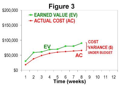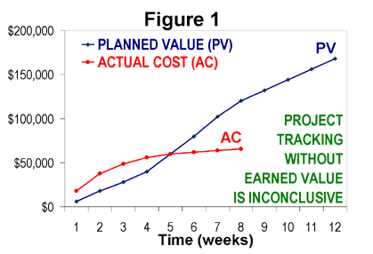 획득 가치 성과 관리를 포함하지 않는 프로젝트 추적의 예를 통해 EVM의 기본 원리를 이해할 수 있다. 그림 1은 시간별 지출 계획을 포함하는 프로젝트의 누적 예산(파란색 선, PV)과 8주차까지의 누적 실제 비용(빨간색 선, AC)을 보여준다. 이 차트만으로는 프로젝트가 예산을 초과했는지, 아니면 일정보다 앞섰는지 판단하기 어렵다.