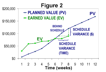 기술적 성과를 객관적으로 측정하기 위해 EVM을 활용한다. 그림 2는 PV 곡선(그림 1)과 함께 EV 곡선(녹색)을 보여준다. 이를 통해 기술적 성과(진행 상황)가 계획보다 빠르게 시작되었지만, 7주와 8주차에 둔화되어 예정보다 뒤처졌음을 알 수 있다. 이는 EVM의 일정 성과 측면을 보여준다.