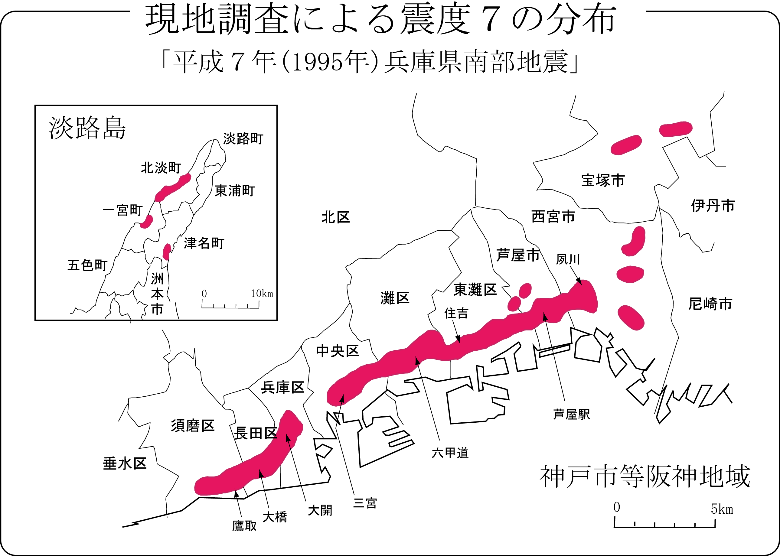 일본 기상청의 현장 조사 결과, 아와지섬 북부(현재 아와지시)와 고베시, 아시야시, 니시노미야시, 다카라즈카시의 특정 지역에서 진도 7의 흔들림이 관측되었다.[11][36][40] 당시 진도 7은 지진계에 의한 계측진도 적용 외 등급이었으며, 현지 조사를 통해 판정되었다. 진도 6 이상 지역은 다음과 같다.[89][13]
