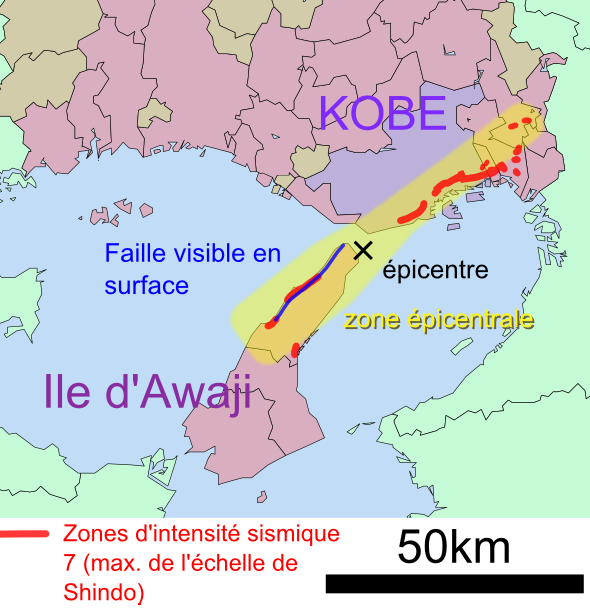 효고현 남부 지진의 본진은 1995년(헤이세이 7년) 1월 17일 오전 5시 46분 52초 (JST)에 발생했다.[98][36] 진앙은 효고현 쓰나군 호쿠단정(현 아와지시) 부근, 즉 아와지섬 북부의 아카시 해협 근처(북위 34.6도, 동경 135.0도[98])였으며, 진원의 깊이는 약 16km였다.[106][36] 일본 기상청은 진앙이 행정구역상 오사카만 수역에 해당하기 때문에 공식 발표에서는 오사카만을 진앙으로 표기했다.[109][110][35][36]