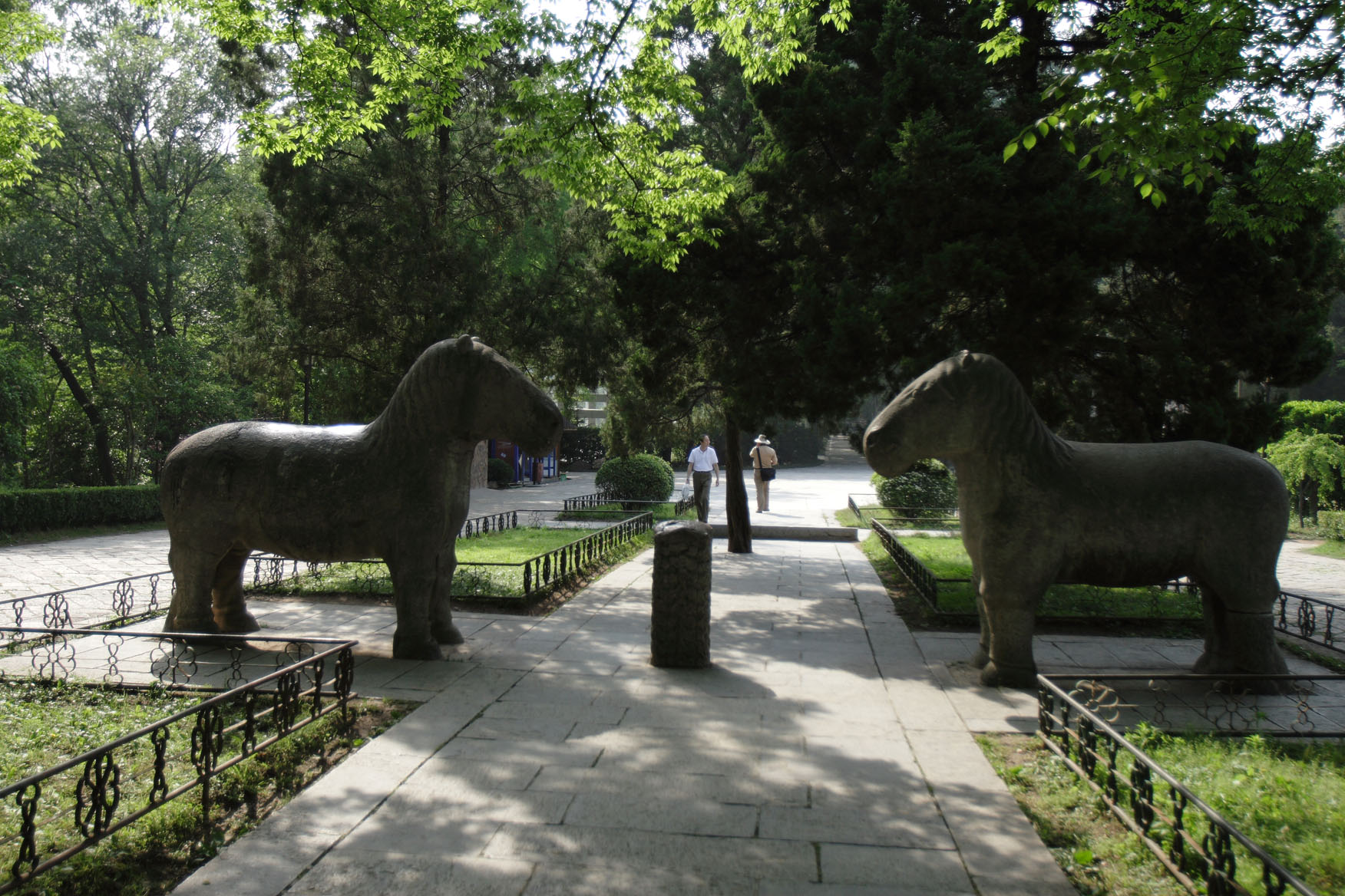 신도(神道)는 난징 시 정부 부지에 있는 1800m 길이의 길이다. 구불구불한 신도는 사방성(四方城) 정자 근처에서 시작된다. 이 길은 여러 구간으로 나뉘는데, 코끼리 길과 옹중(翁仲) 길이 있다. 코끼리 길에는 12쌍의 6종류의 동물들(사자, ''해치'', 낙타, 코끼리, ''기린'', 말)이 무덤을 지키며 늘어서 있다. 그 너머에는 화표(華表)라고 불리는 기둥이 있다. 이어서 옹중 길을 따라가면, 수백 년 동안 4쌍의 대신과 장군(또는 무사 수호상, ''옹중'') 석상이 세워져 저승으로 가는 길을 지키고 있다.
