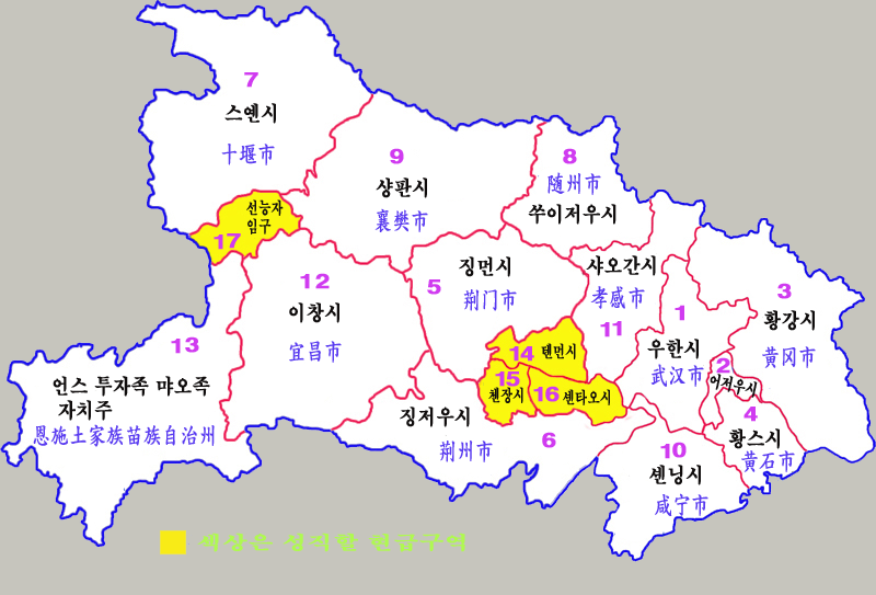 후베이성은 1개의 부성급시, 12개의 지급시, 1개의 자치주로 구성되어 있다.![]() | ||||