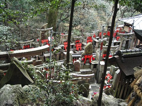 에이쿄 10년(1438년), 고후카쿠 천황의 칙령으로 무로마치 막부 6대 쇼군 아시카가 요시노리가 산정에 있던 이나리 신사의 사당을 산록으로 옮겼다는 전승이 후지모리 신사에 전해진다. 세이 쇼나곤의 『마쿠라노소시』에는 이나리 참배 시 헐떡이며 등산하는 모습이 기록되어 있어,[60] 이 무렵 이나리 신사는 산상의 신사였다고 생각된다.