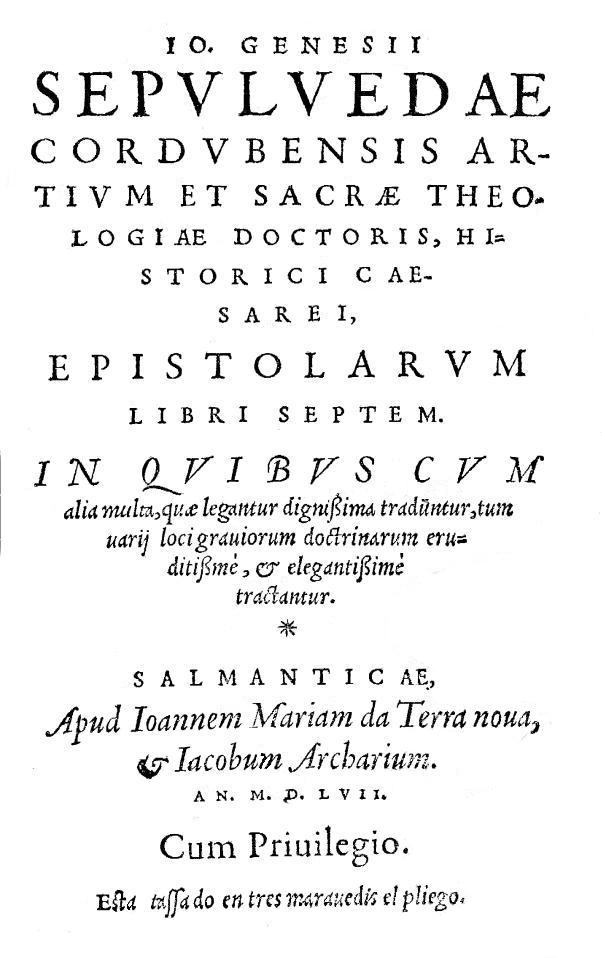 세풀베다는 아리스토텔레스의 "선천적 노예인 설"을 인디오에게 적용하여 이들의 토지, 자유, 재산을 빼앗는 것이 정당하다는 저서 『제2의 데모크라테스』 출판을 카를 5세에게 요청했지만, 살라망카 학파와 라스 카사스에 의해 저지되었다. 1550년부터 1551년까지 바야돌리드에서 열린 심의회에서 세풀베다는 라스 카사스와 대결했지만, 논쟁에서 밀려 출판 허가를 받지 못했다.