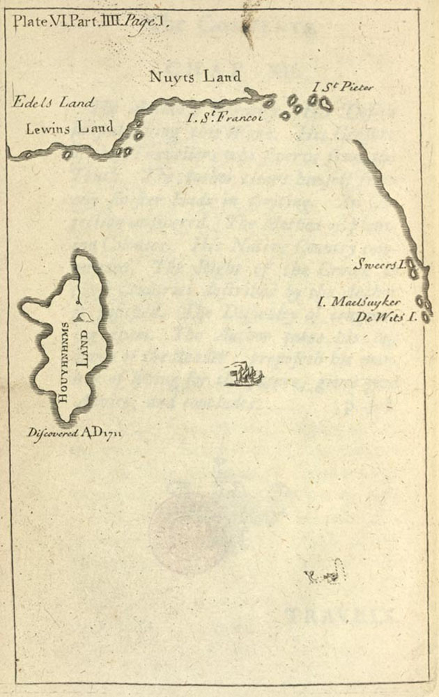 지도에는 후이넘 랜드 북쪽에 에델 랜드와 르윈 랜드가, 북동쪽 본토에는 뉘츠 랜드가 표시되어 있다. 동쪽에는 세인트 프란시스와 세인트 피터 섬이, 더 동쪽에는 스위어스, 마츠위커, 데 윗 섬이 있다. 그러나 지도의 축척은 다소 부정확하다. 에델 랜드와 르윈 랜드는 실제로는 약 1000km 떨어져 있지만 지도에는 인접하게 표시되어 있다. 또한, 호주 남서쪽 지점인 케이프 르윈에서 태즈메이니아 남쪽 끝의 마츠위커 섬까지의 호주 대만곡의 범위는 3000km가 넘는다.