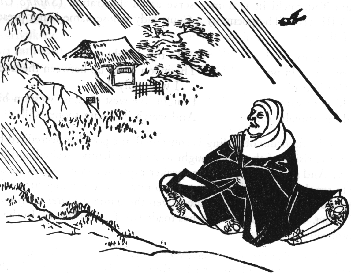 히시카와 모로노부가 그린, 슌제가 뻐꾸기에 관한 자신의 시를 낭송하는 모습