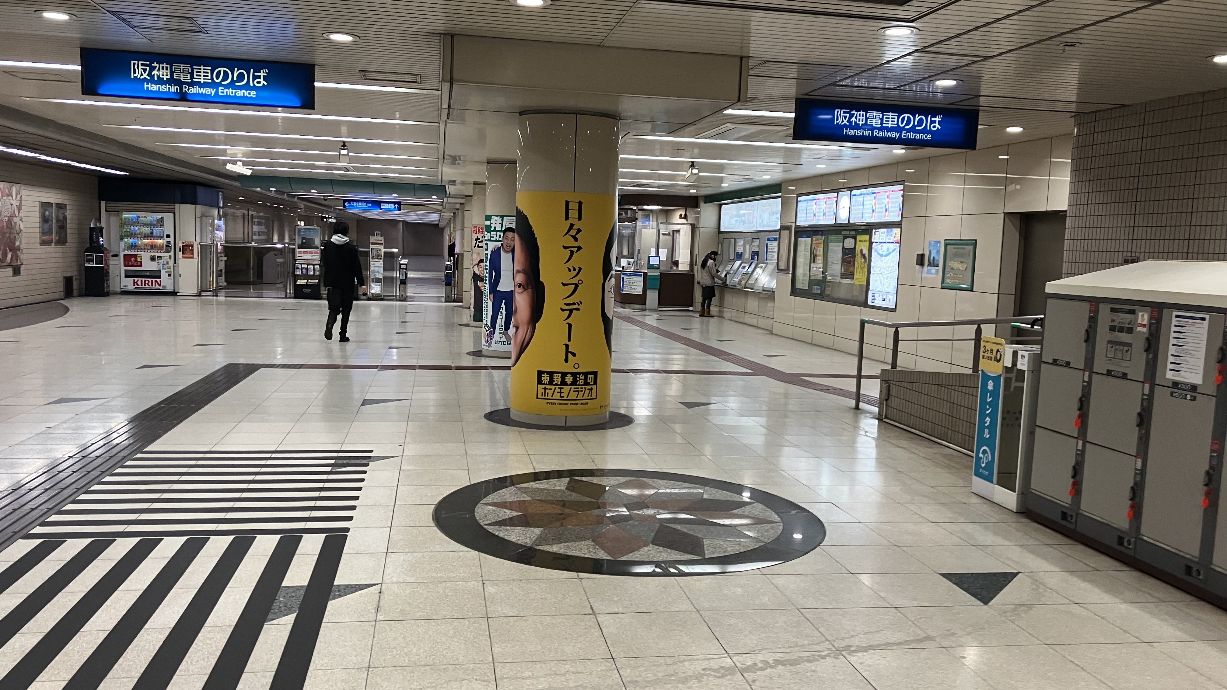 서일본 여객철도(JR 서일본)와 게이한 전기철도의 노선을 이용할 수 있다. 한신 전기철도 본 역 도착 시에는 어느 노선의 환승 안내가 이루어지는 것은 아니지만 역 출입구 안내에는 각 역으로 가는 가장 가까운 출입구가 표시되고 있다[36].