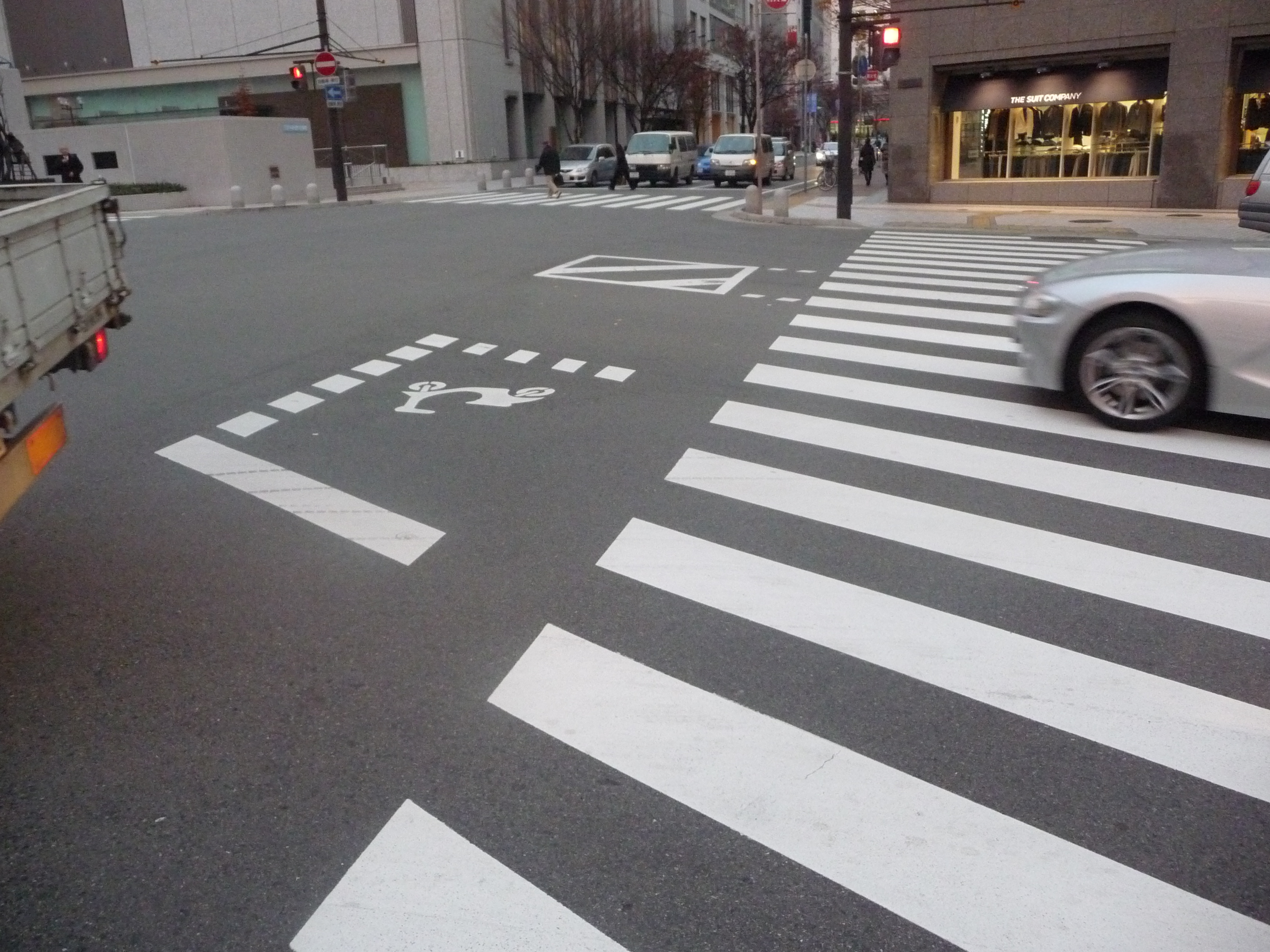 注:軽車両は図の様な交差点でも二段階右折が必要だが、原動機付自転車の場合は条件がある。