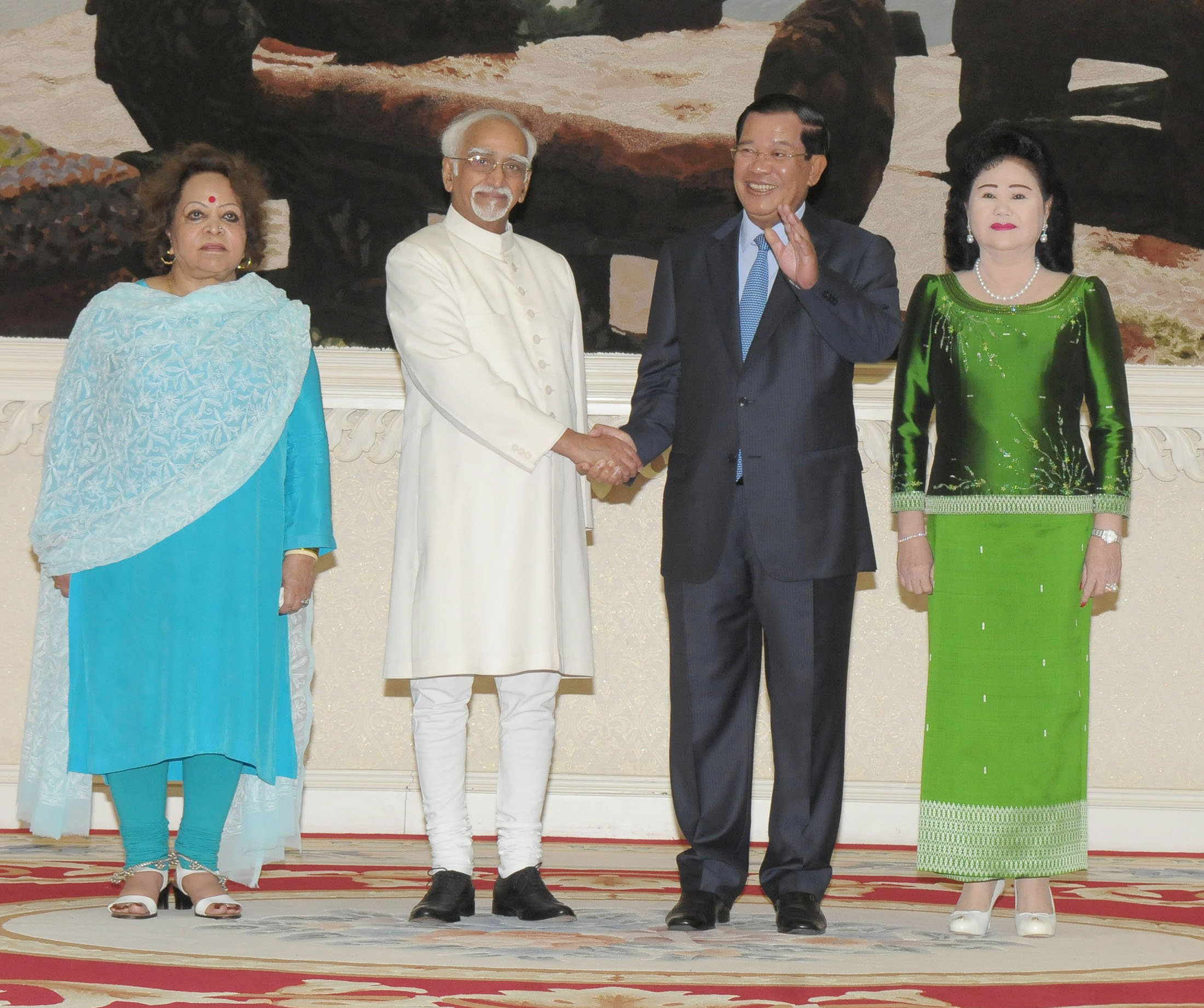 훈 센과 그의 아내 분 라니(Bun Rany)가 2015년 9월 16일 프놈펜 평화궁에서 당시 인도 부통령의 공식 환영 행사에 참석한 모습