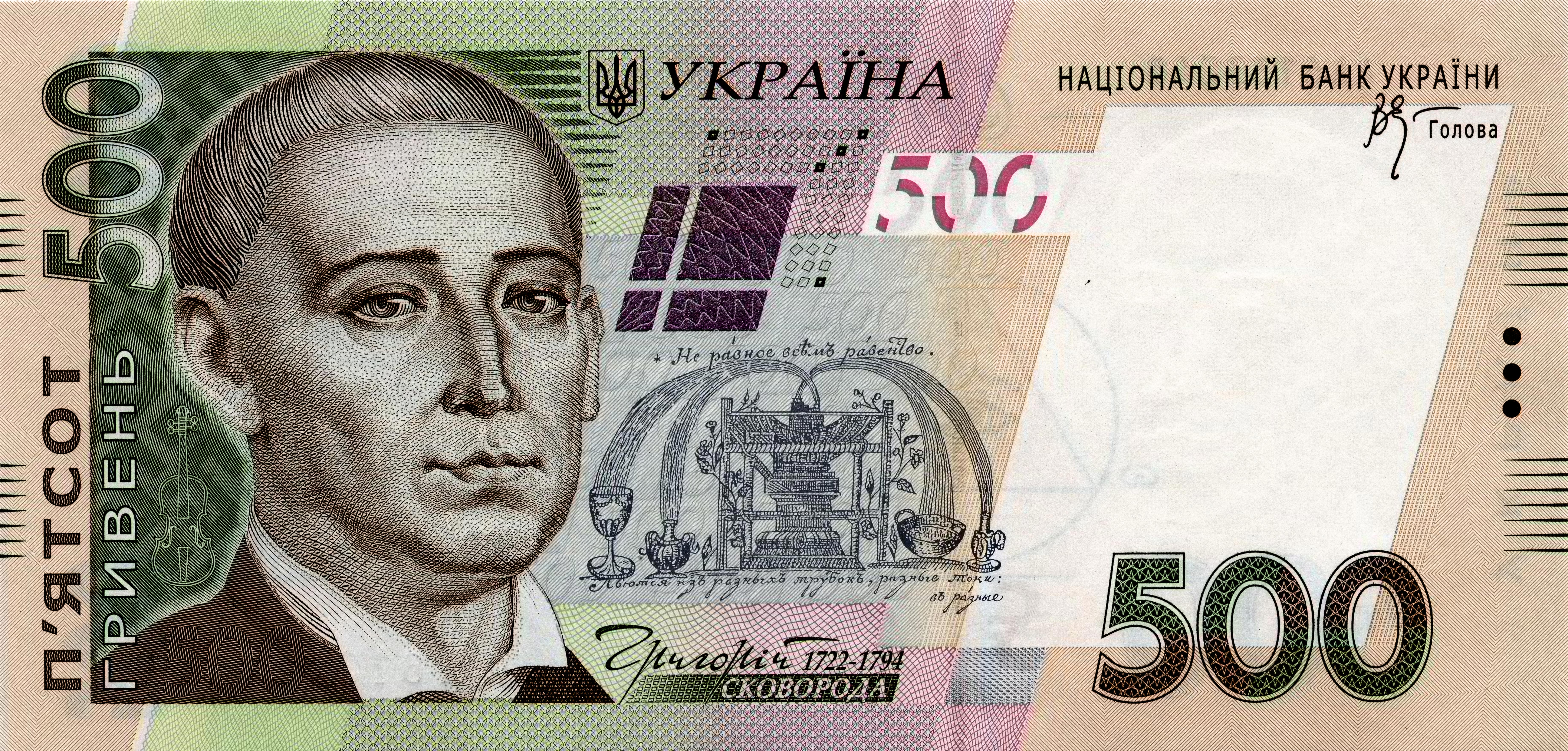 스코보로다의 초상은 2006년 9월 15일부터 우크라이나에서 유통되는 두 번째로 큰 지폐인 500 흐리브냐 지폐에 사용되고 있다.[23]