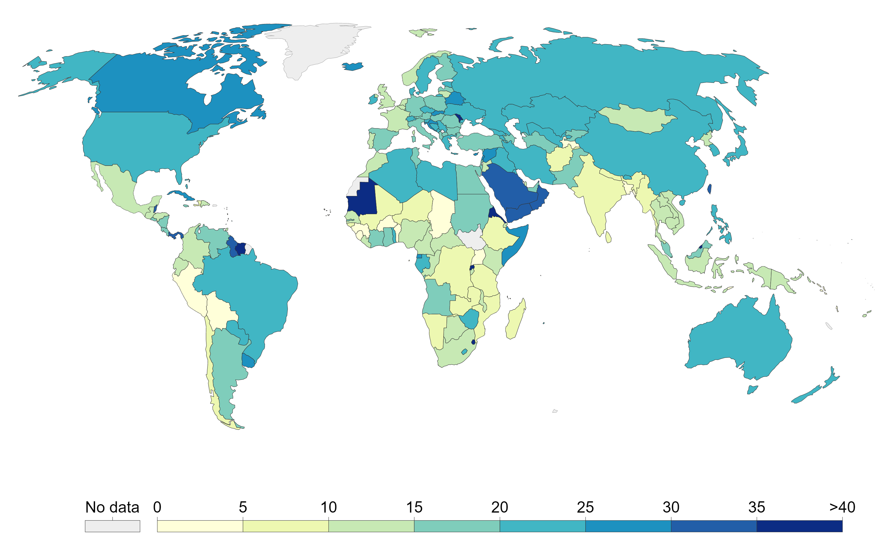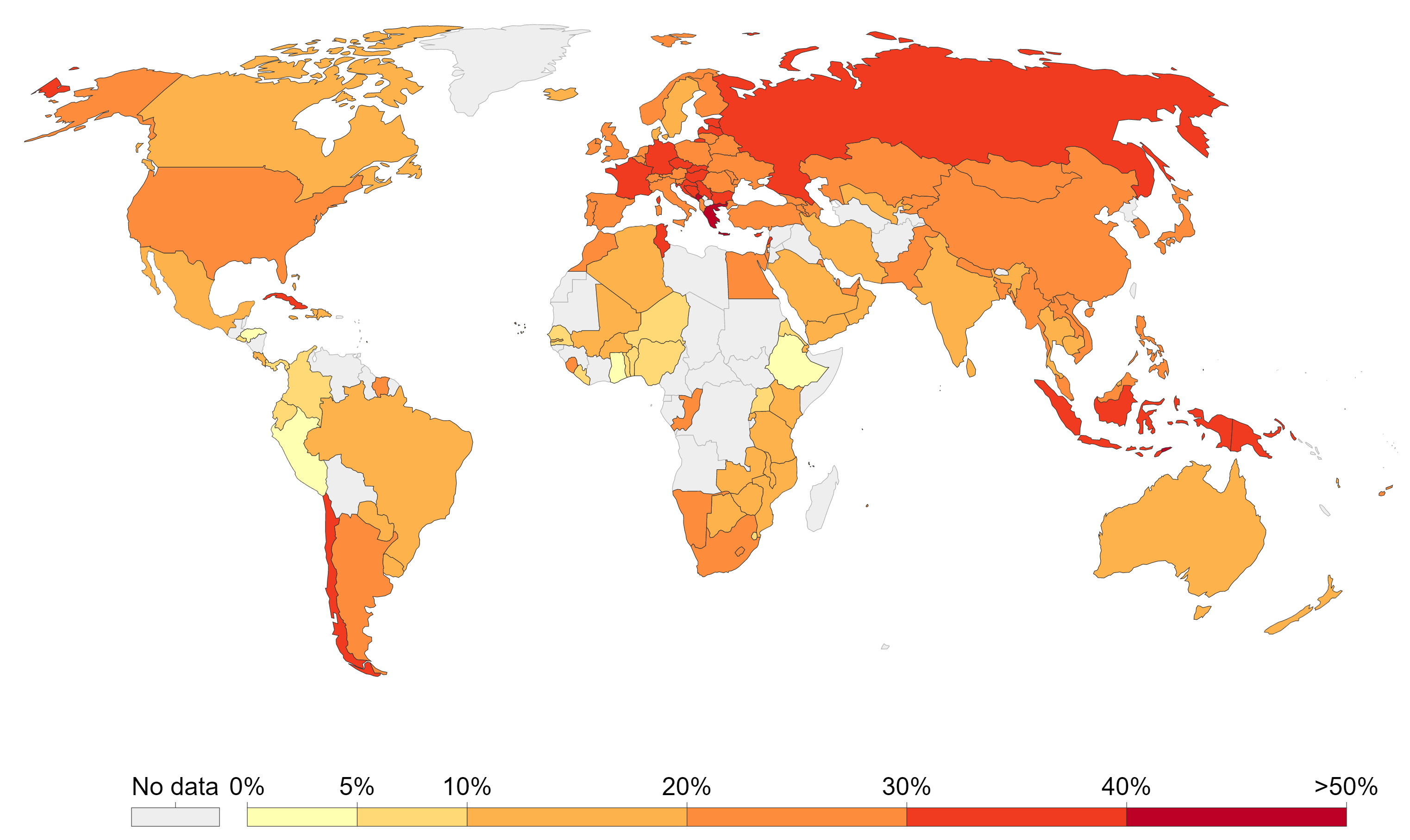 THE GLOBAL HEALTH OBSERVATORY > World Health Statistics >Prevalence of current tobacco use among persons aged 15 years and older (age-standardized rate)(世界健康展望台>世界保健統計>15歳以上の人の現在のタバコ使用の有病率(年齢標準化率))