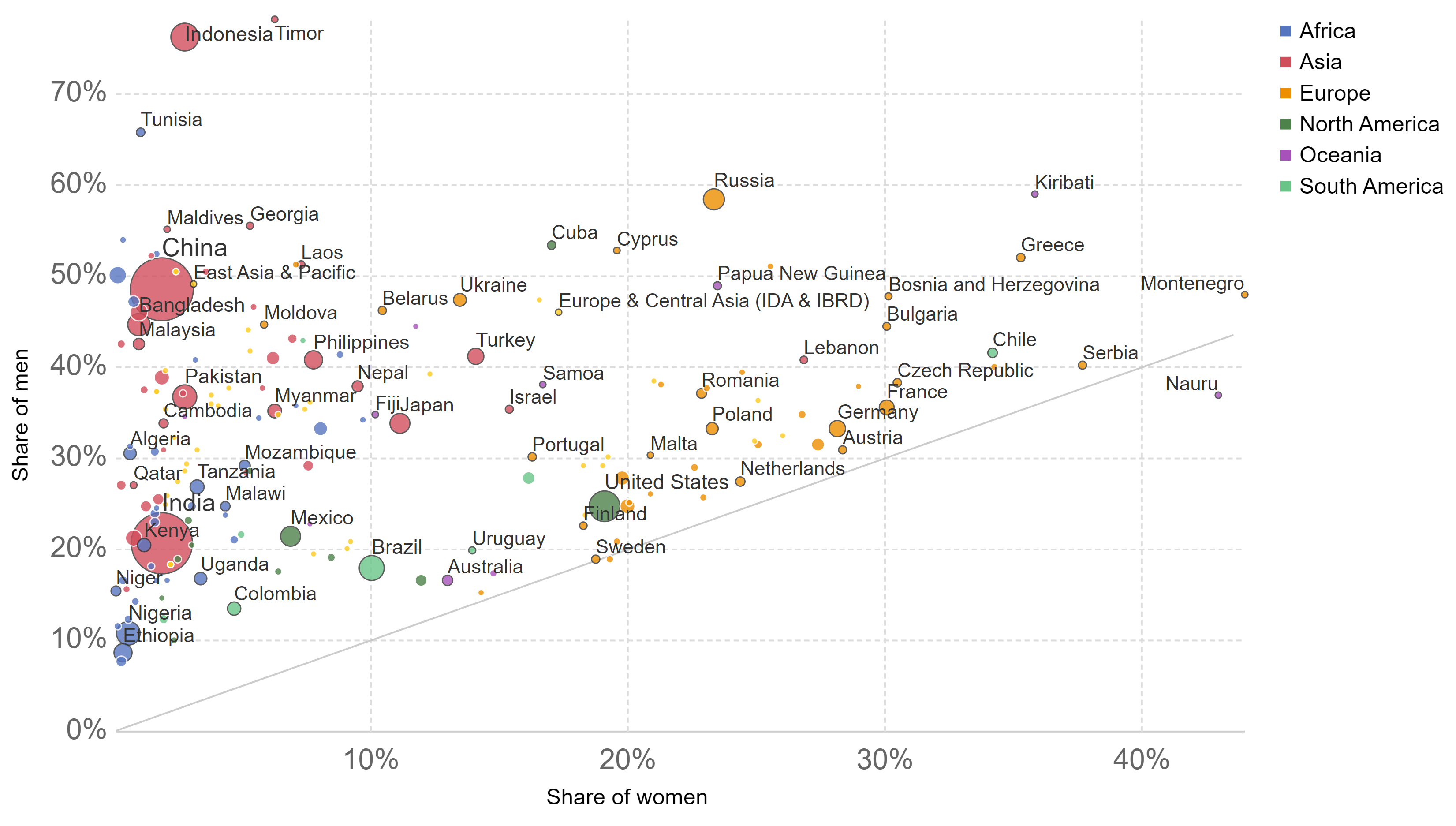 세계 보건 기구(WHO)와 경제 협력 개발 기구(OECD)의 통계에 따르면, 국가별 흡연율은 큰 차이를 보인다. 개발도상국은 선진국에 비해 흡연율이 높으며, 특히 동남아시아, 동아시아, 동유럽 일부 국가 및 근동 지역에서 높은 흡연율을 나타낸다. 여성 흡연율은 동아시아 국가에서 매우 낮고, 서방 선진국에서는 상대적으로 높다.