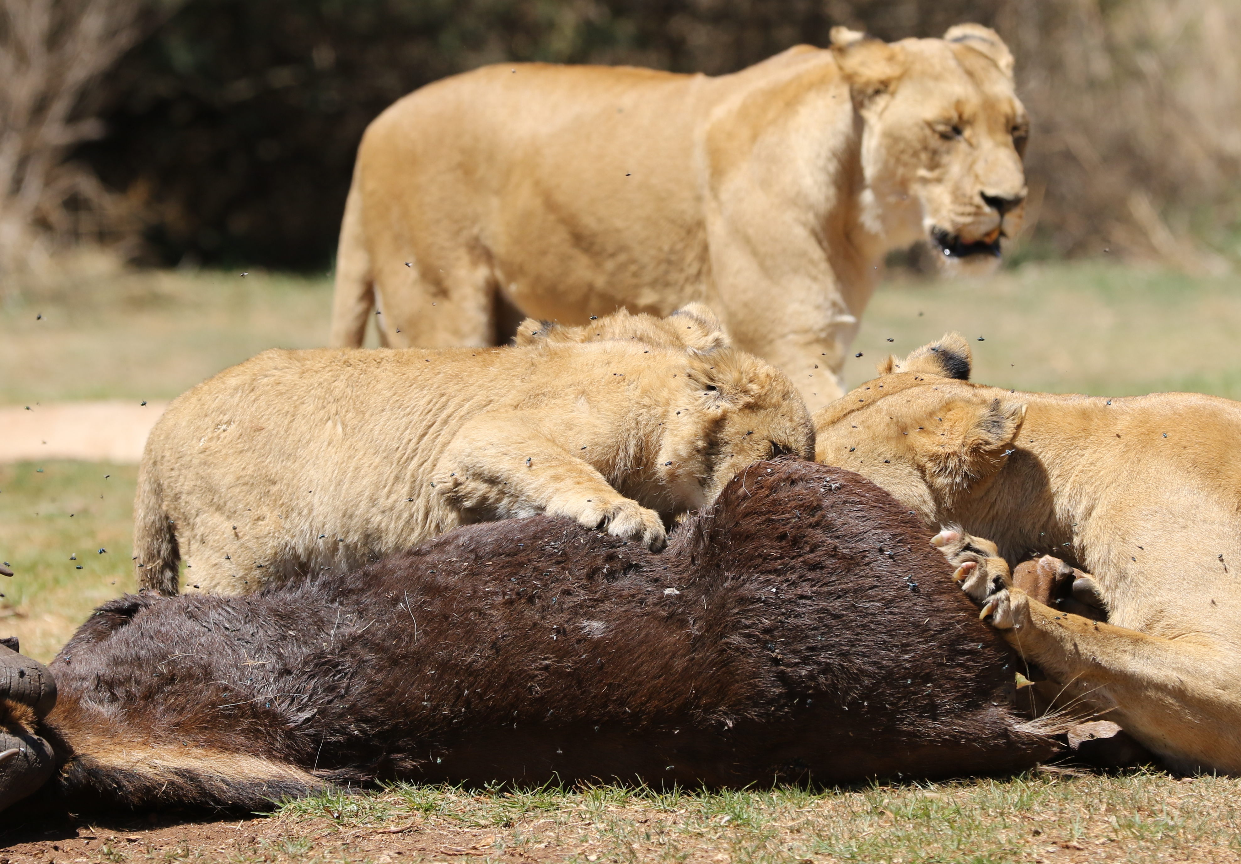 크루거스도르프 게임 공원(Krugersdorp Game Park)(남아프리카 공화국 가우텡주)에서 검은누의 사체를 먹는 사자