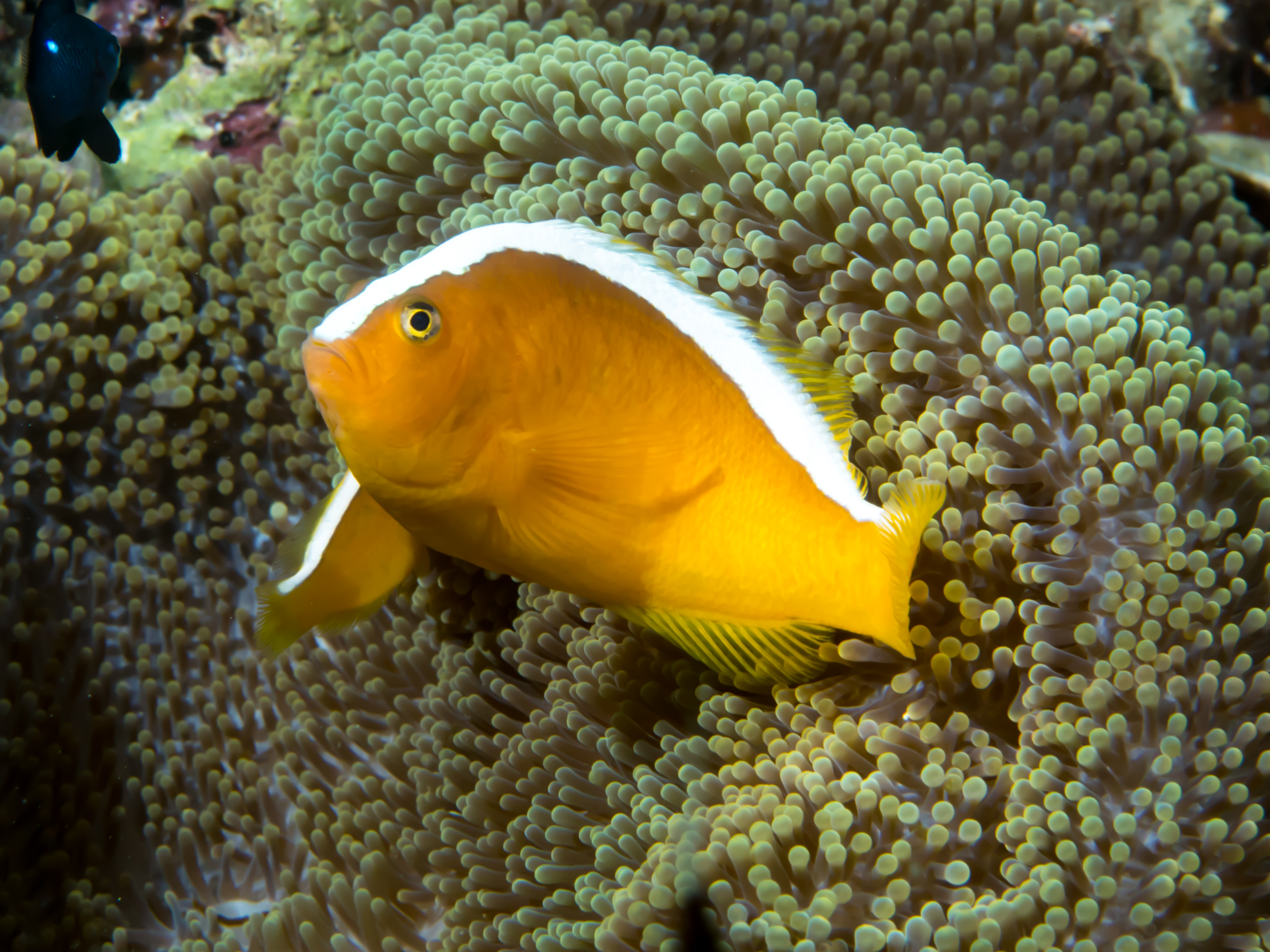 | 토아카흰동가리 | A. polymnus (Linnaeus, 1758) | 전장 약 15cm. 몸 윗부분은 검지만, 앞뒤에 흰색 안장 모양 반점이 있고, 꼬리지느러미도 흰색이다. 얼굴과 배는 주황색이다.[38] | 서태평양 열대 해역 | 이보하타고 말미잘 S. haddoni[51][52] |