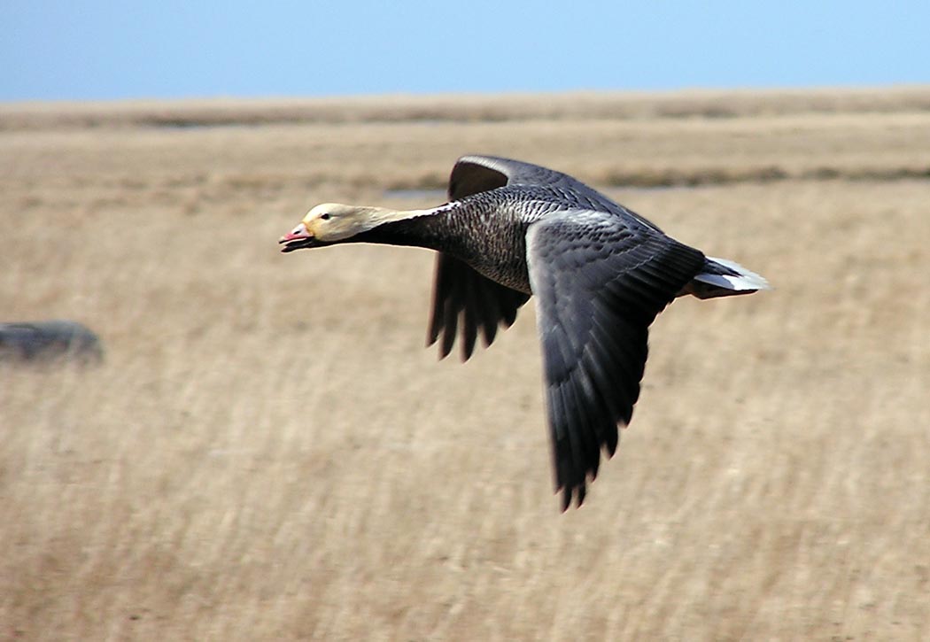 큰흰이마기러기는 밝은 주황색 다리와 흰 이마 무늬가 특징인 기러기과의 조류로, 회색기러기보다 작고 작은흰이마기러기보다 크며, 북아메리카와 유라시아 북부에서 번식하고 다양한 지역에서 월동하며, 깃털 동위원소 분석으로 이동 경로 추적 및 조류 인플루엔자 연구에 활용된다. - 미국의 새 - 고니